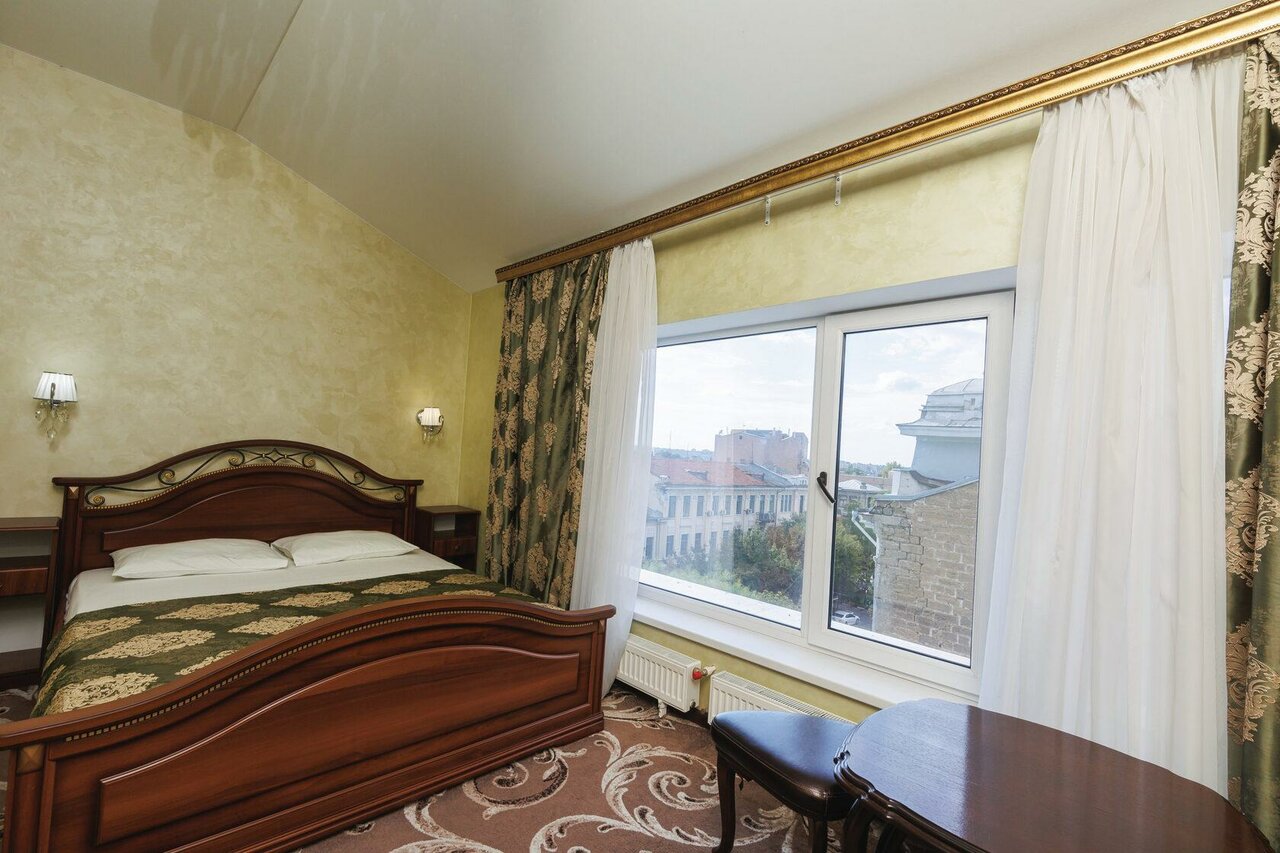 Замечательный отель в самом центре города с очень скромной ценовой политикой. Рядом все достопримечательности, кафе, театры. Номер прекрасный, с видом на город. Всё чисто, мебель новая. Огромные окна с видом на город. Чайник, холодильник, фен. Отдельно хочется отметить огромную душевую кабину. Персонал очень улыбчивый, приятный, вежливый, мгновенно решили вопрос с полотенцами. И заселили на час раньше совершенно без вопросов. В отеле есть лифт, всего 5 этажей. В номере было жарковато и приходилось открывать окно. Очень сильно греет батарея. Из минусов — немного шумно — улица и особенно слышимость соседей.