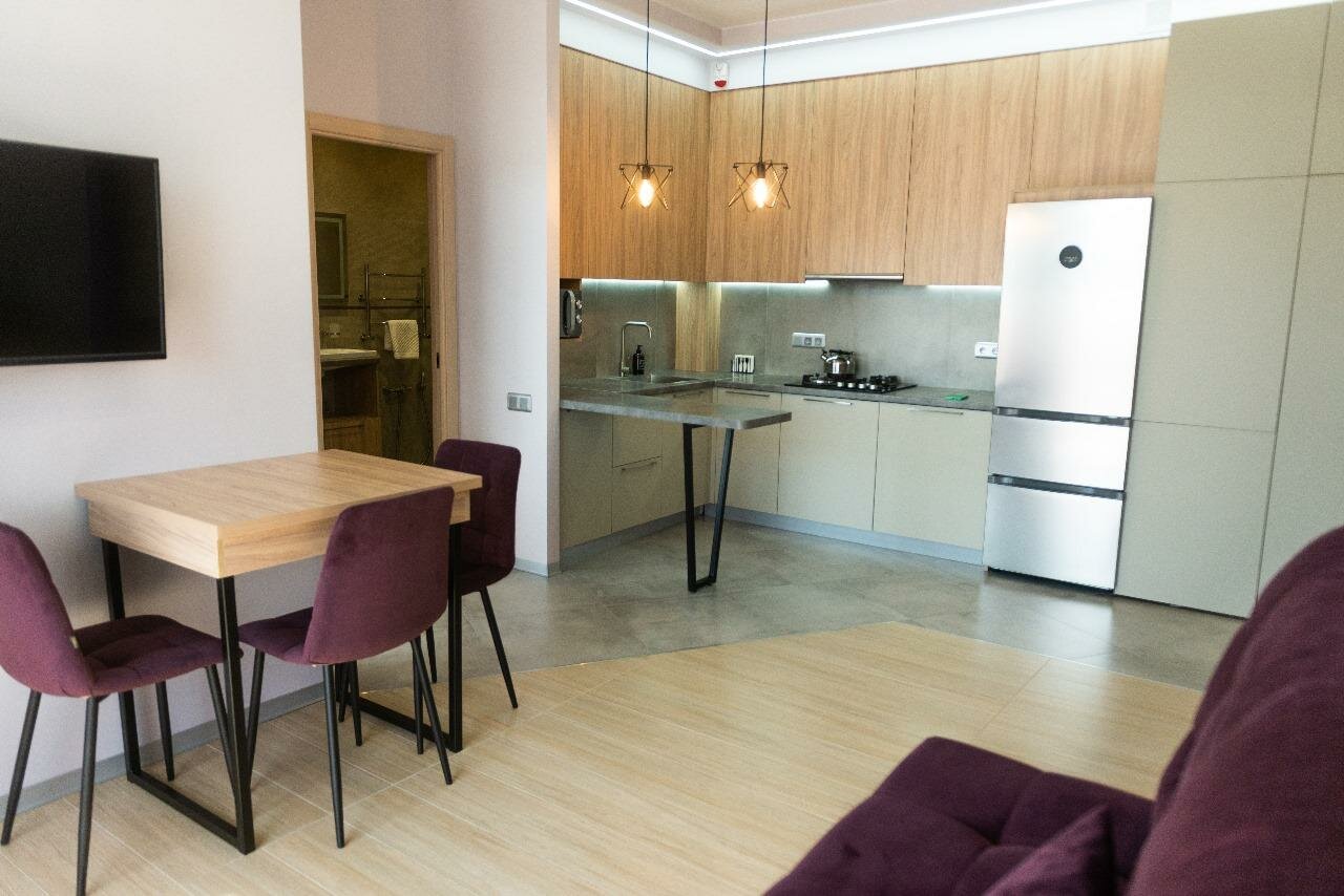 Гостям предлагаются просторные квартиры повышенной комфортности с одной большой двухспальной кроватью с ортопедическим основанием, раскладным диваном и балконом. Дизайнерский интерьер, оснащенный самыми современными решениями.