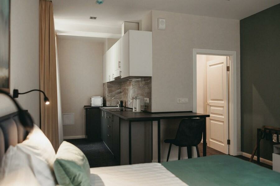 Красивый, современный отель! Порадовал во всех отношениях -Просторные, удобные номера, стильно оформлены, с балконами и панорамными окнами -удобные кровати, матрасы, подушки! Все новое и хорошего уровня -укомплектованная кухня, свч, стир. машина, барная стойка. вся мебель в номере соответствует хорошему отелю! - есть розетки!!!!и выключатели в нужных местах!!! - удобный большой, хорошо оснащенный санузел с нормальной звукоизоляцией -внимательное и гостеприимное отношение персонала, и всей команды отеля -красивое оформление ресепшен, сразу попадаешь в атмосферу хорошего городского отеля без суеты - есть где оставить машину, хороший фасад здания. И конечно же ждем открытия кафе, для уютных завтраков!