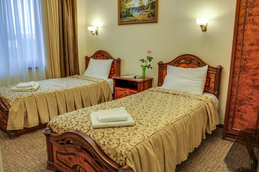 Удобства: — Номера с кондиционером, Wi-Fi, телевизором, санузлом, звукоизоляцией. — 2 ресторана, кафе, бар, летняя веранда, банкетный и конференц-залы. — Бесплатная парковка, платный трансфер (аэропорт/вокзал), камера хранения. — Услуги для детей: манеж, кроватки, игровая комната, детское меню. — Дополнительно: салон красоты, прачечная, круглосуточная стойка регистрации.