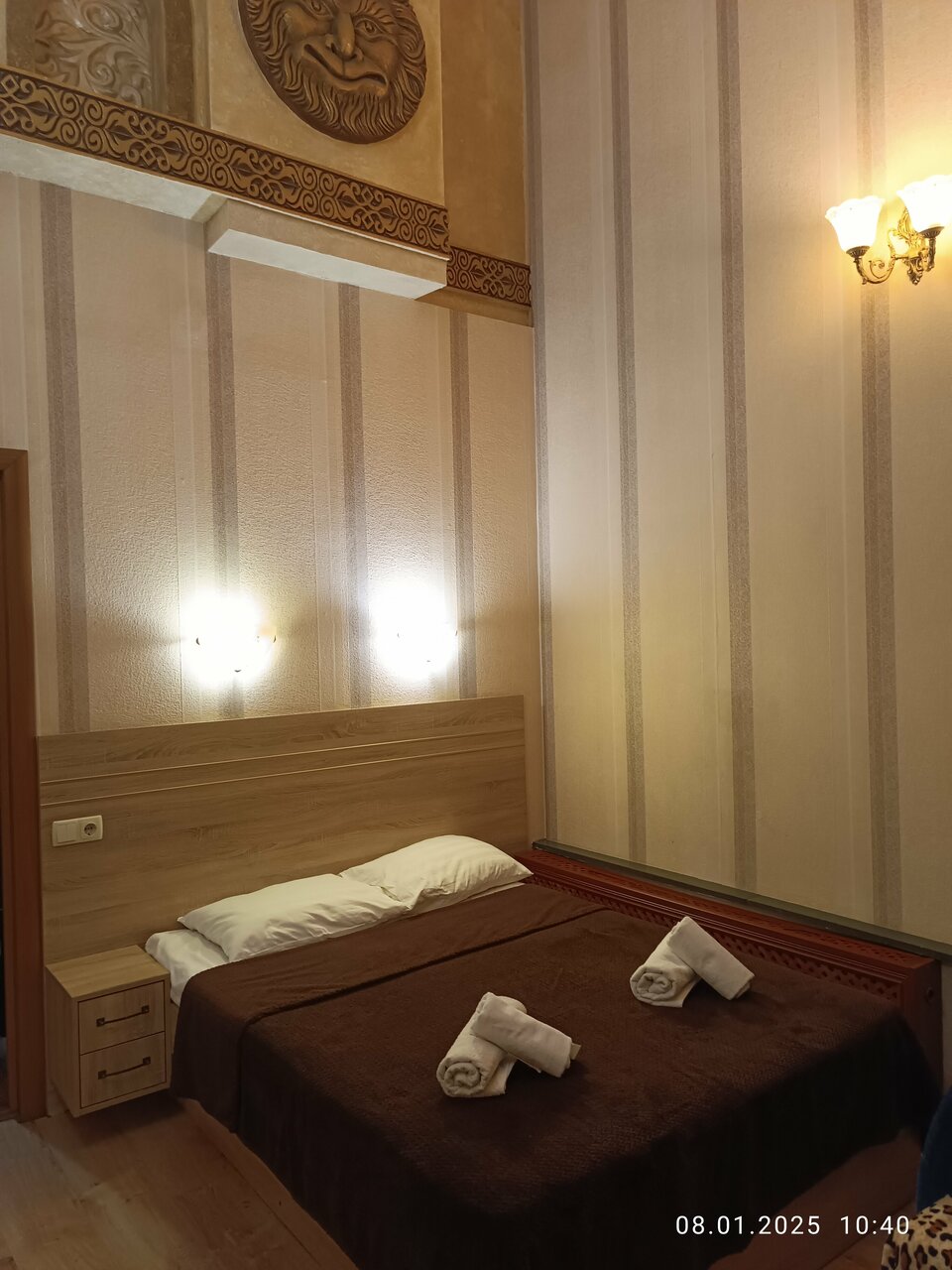 Не рекомендую тк жесть! Рассказываю: приехал в Симферополь в командировку на день, поезд прибыл в 5:30 утра, обратно в 18:00 автобус, на время между нужна была гостиница. После пары отелей,где не было мест добрался сюда. Сказали что есть места с ранним выездом в 12:00 нужно заплатить 2500, если дольше то еще 14000!!!!!!! Окей согласился на ранний выезд, оплатить переводом 2500. Дали ключ, проводили до номера. В номере ремонт середины 90х годов, слышимость 100% слышно как вибрирует телефон в соседнем номере, за что они хотят 14к в сутки не ясно. Не рекомендую точно! А еще забыл добавить, что в номере было жутко прокурено и не убрано ( на унитазе лобковые волосы).