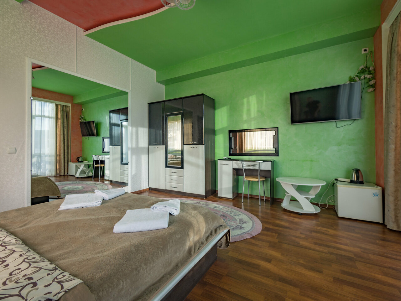 Номер семейный люкс пятиместный, в номере 2 большие кровати и 1 маленькая, тренажер эллипсоид, душ, туалет, ТВ, холодильник, чайник