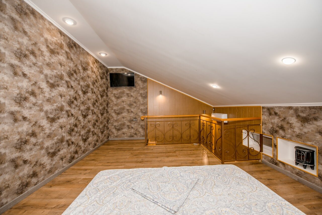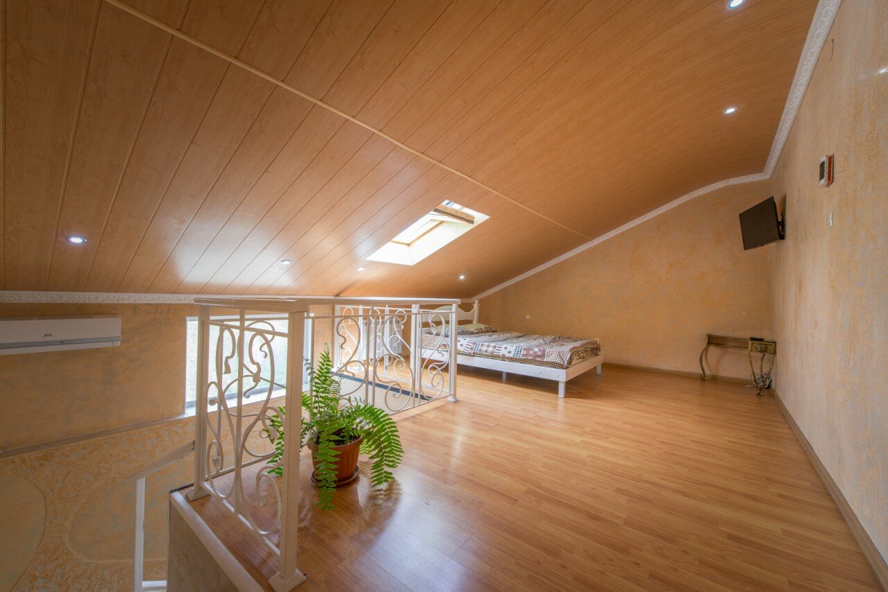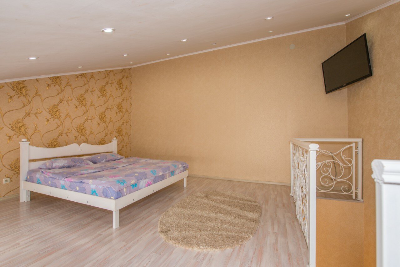 Просторный номер с двуспальной кроватью и диваном. В номере есть кухня, санузел с душевой. Отдельная спальня на втором ярусе. Кондиционер, телевизор. Отдельно в нашем мини отеле есть баня/сауна с бассейном.