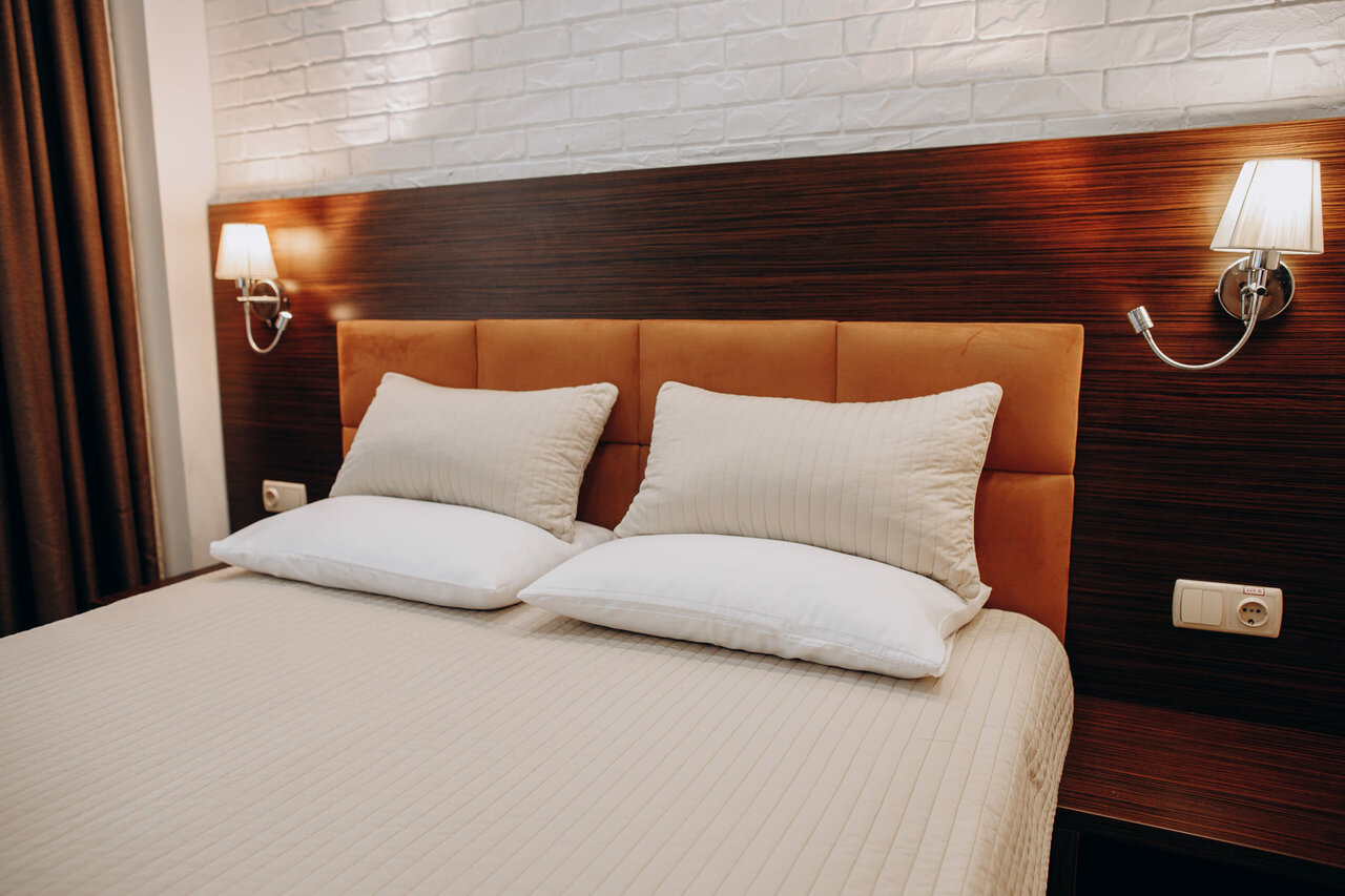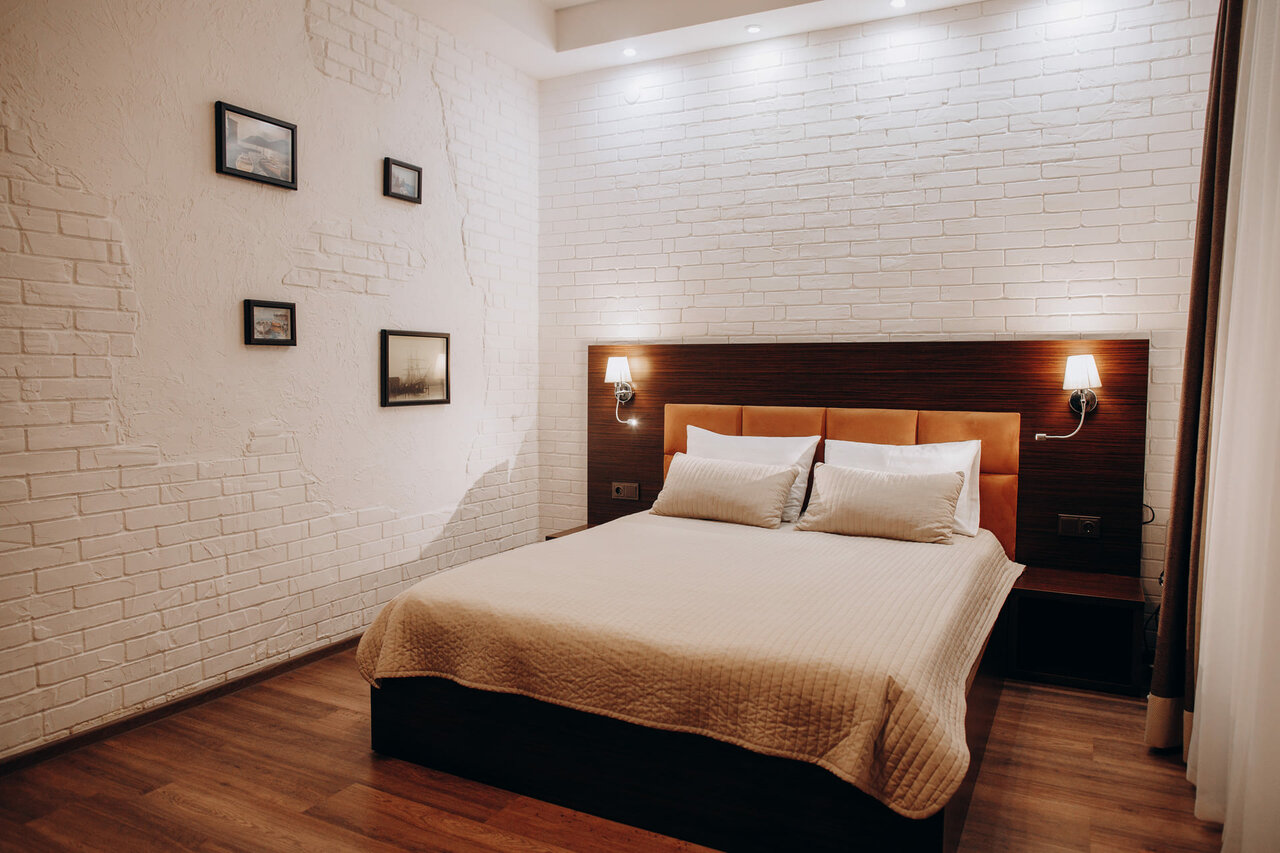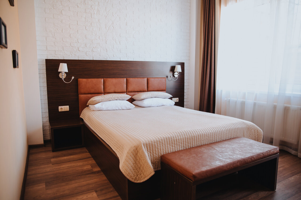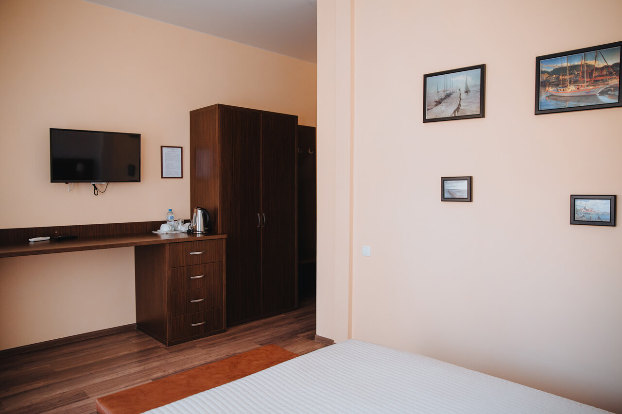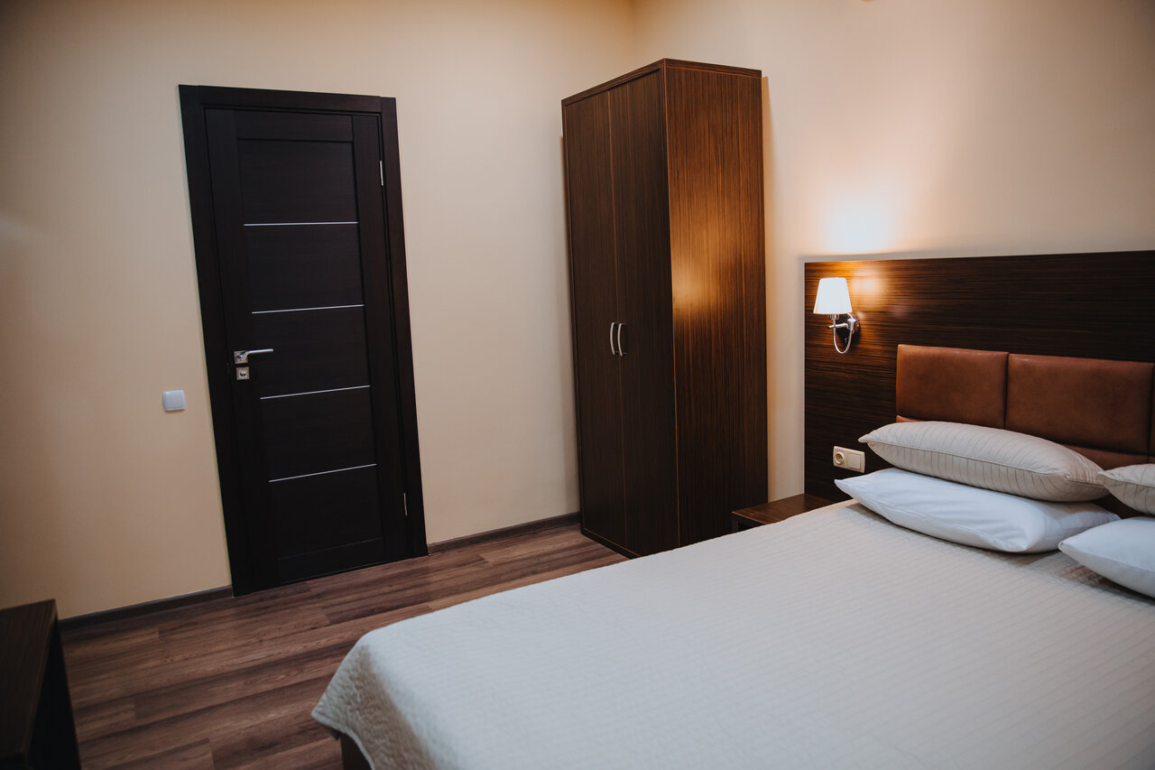 двухместный номер с 1-й большой двуспальной кроватью, шкаф-гардероб, совместный санузел туалет-душевая, телевизор с плоским экраном и TV каналами, бесплатный Wi-Fi, кондиционер, холодильник, фен, комплект полотенец, мини парфюмерия, тапочки.