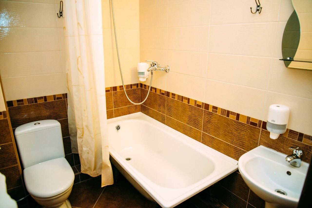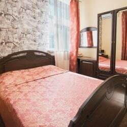 Гостиница в центре города это плюс, бронировали номер с двуспальной кроватью-итог:две кровати сдвинуты вместе, матрасы съезжают, в санузел полу ванная, санузел тесный. В номере нет даже чайника, из посуды два дешёвых стакана. Цена завышена для таких номеров