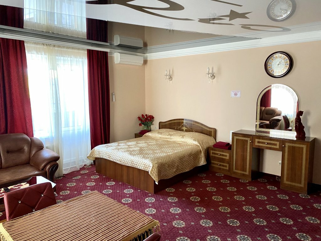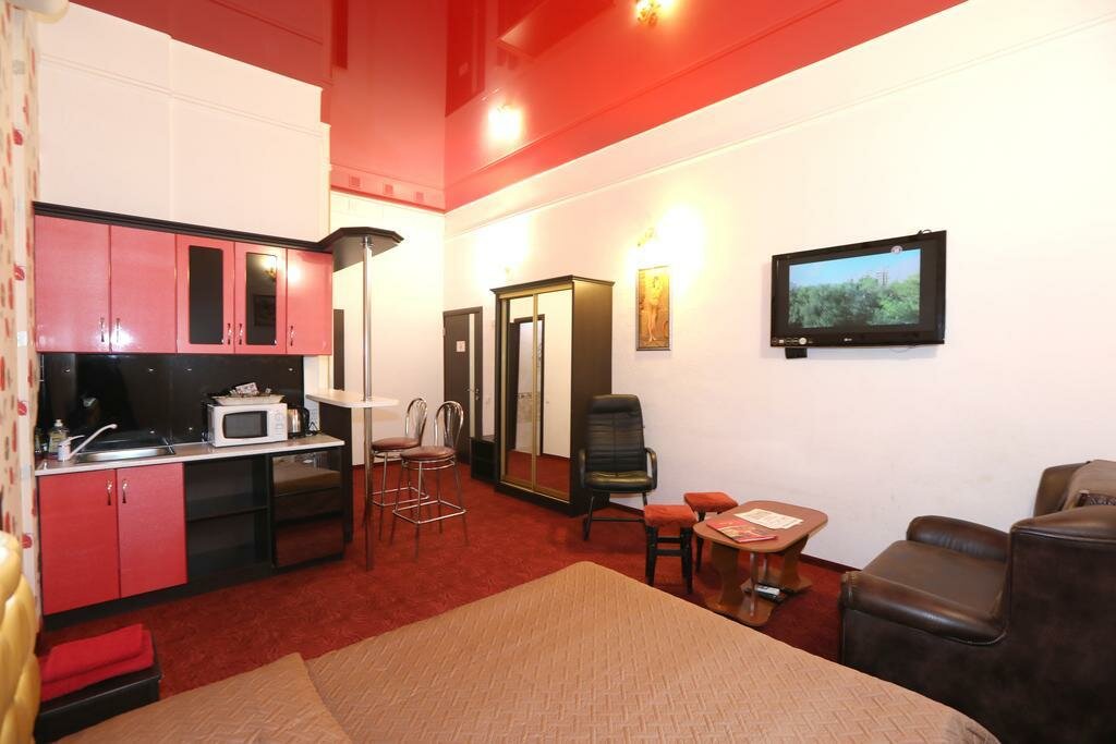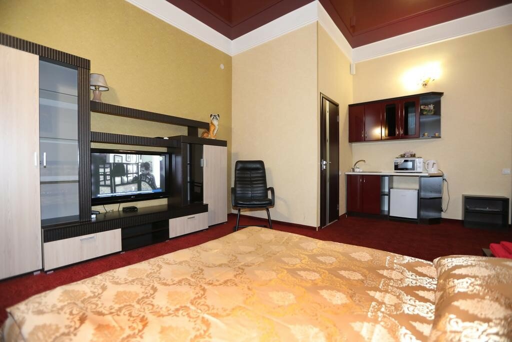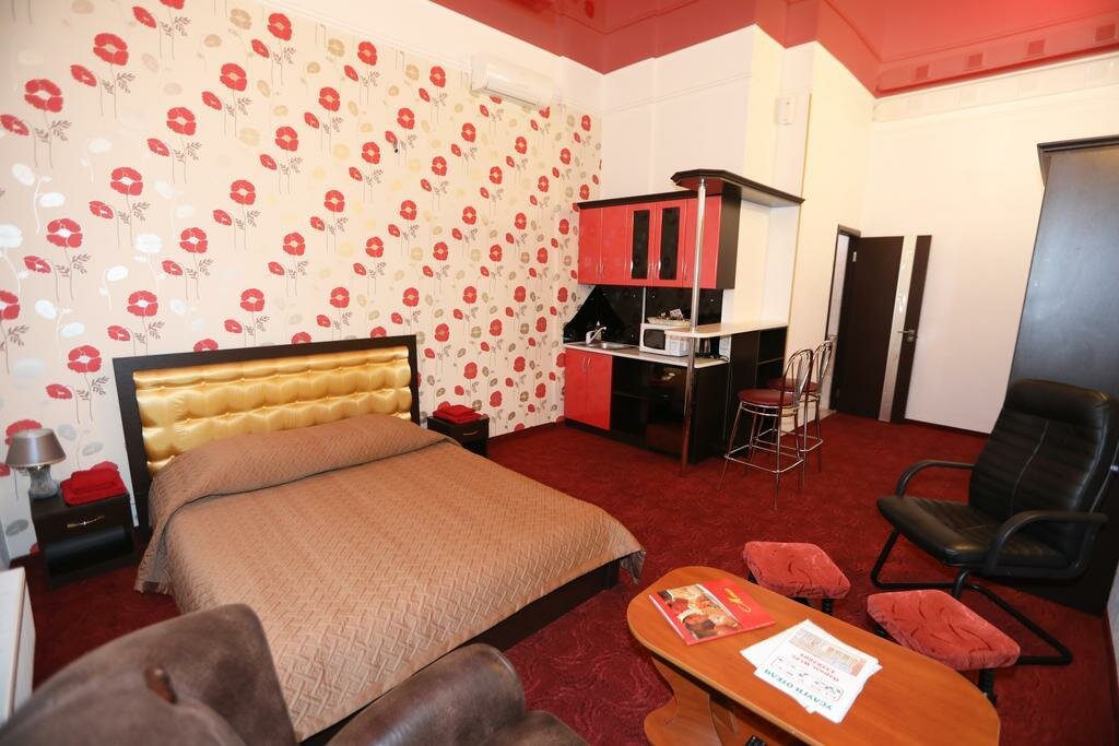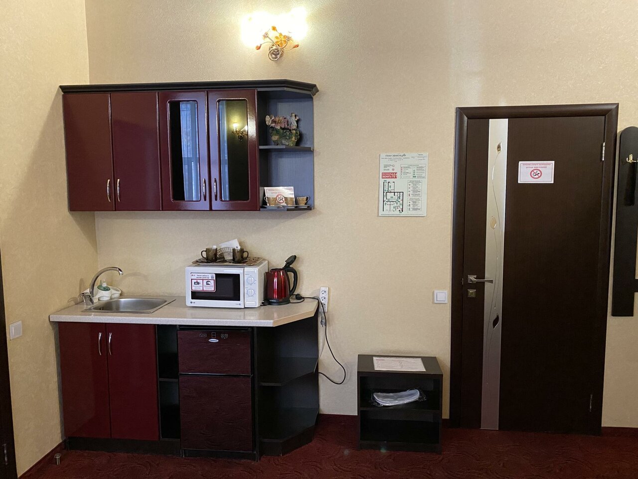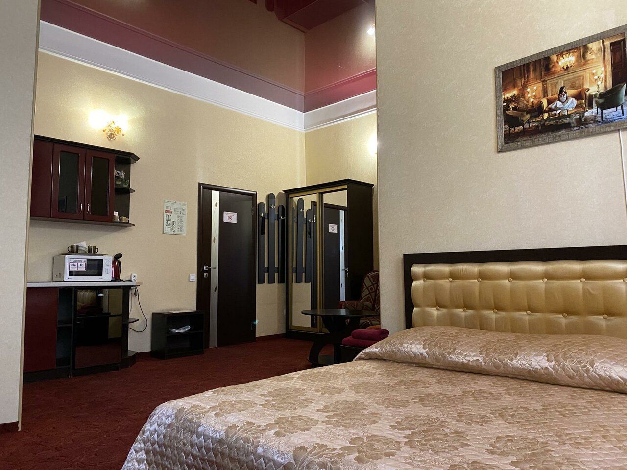 Просторный однокомнатный номер класса люкс выполнен в золотисто-бежевых и бордовых тонах, что создает атмосферу спокойствия и уюта.В номере имеется оборудованный кухонный уголок, посуда, електр. чайник, микроволновая печь, холодильник.