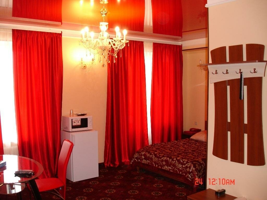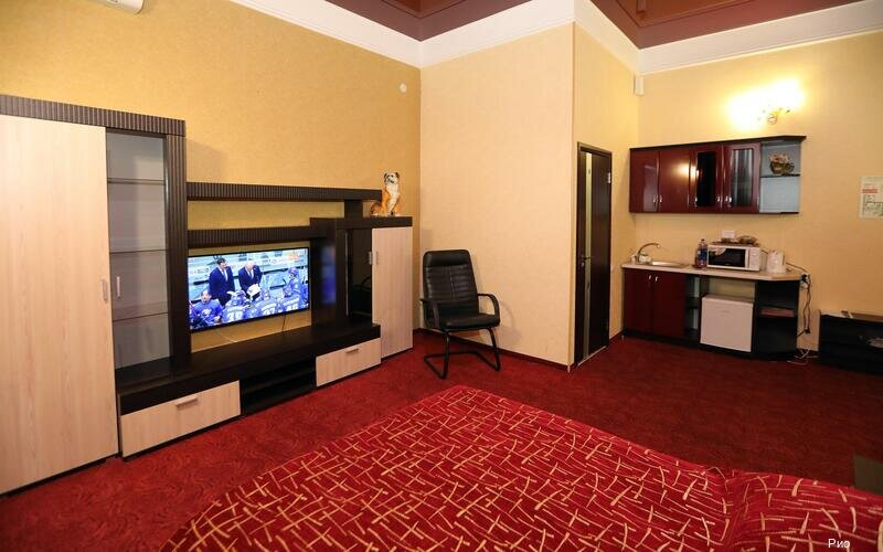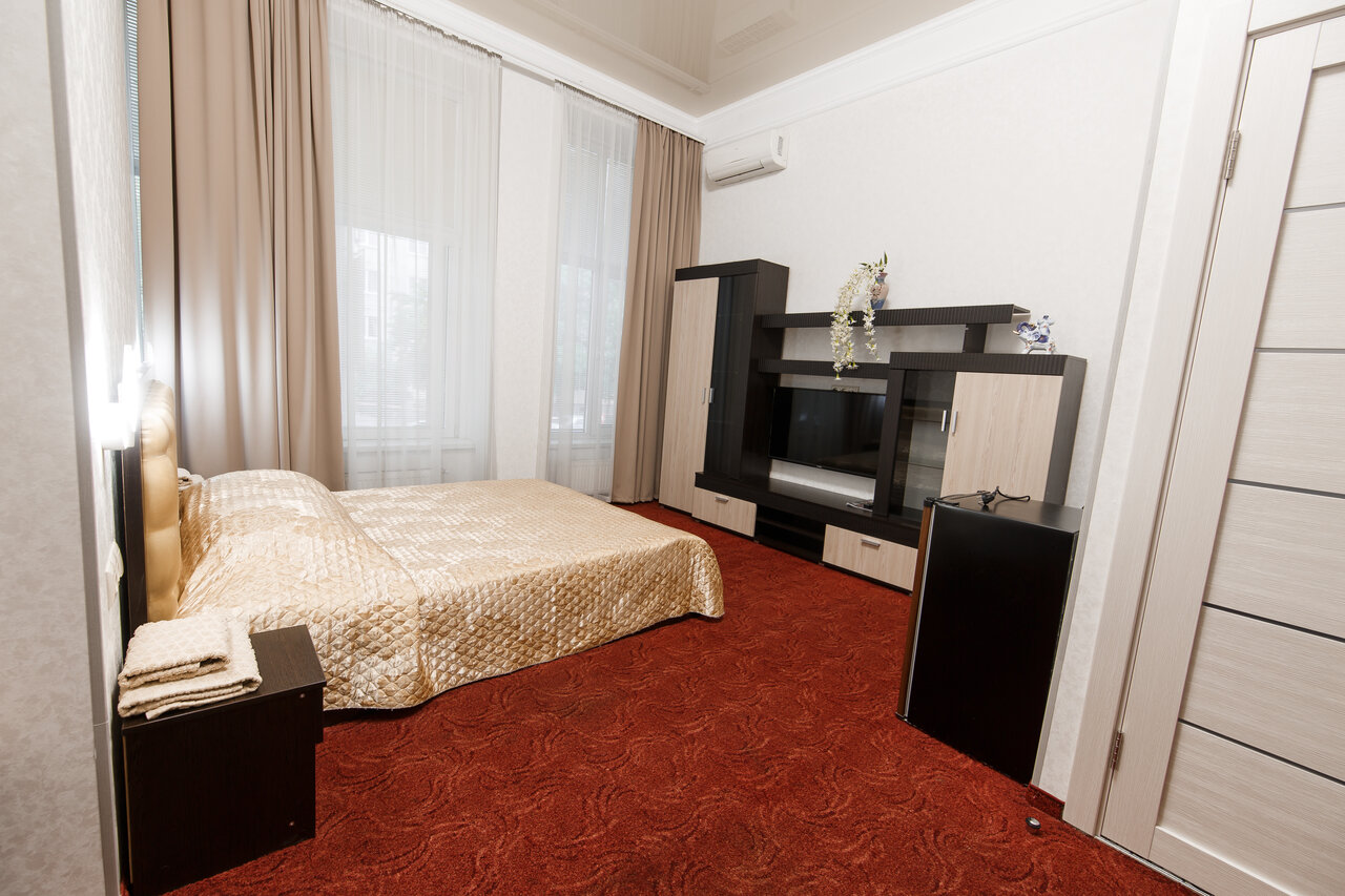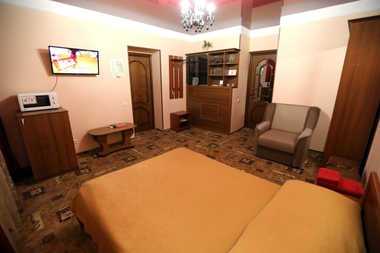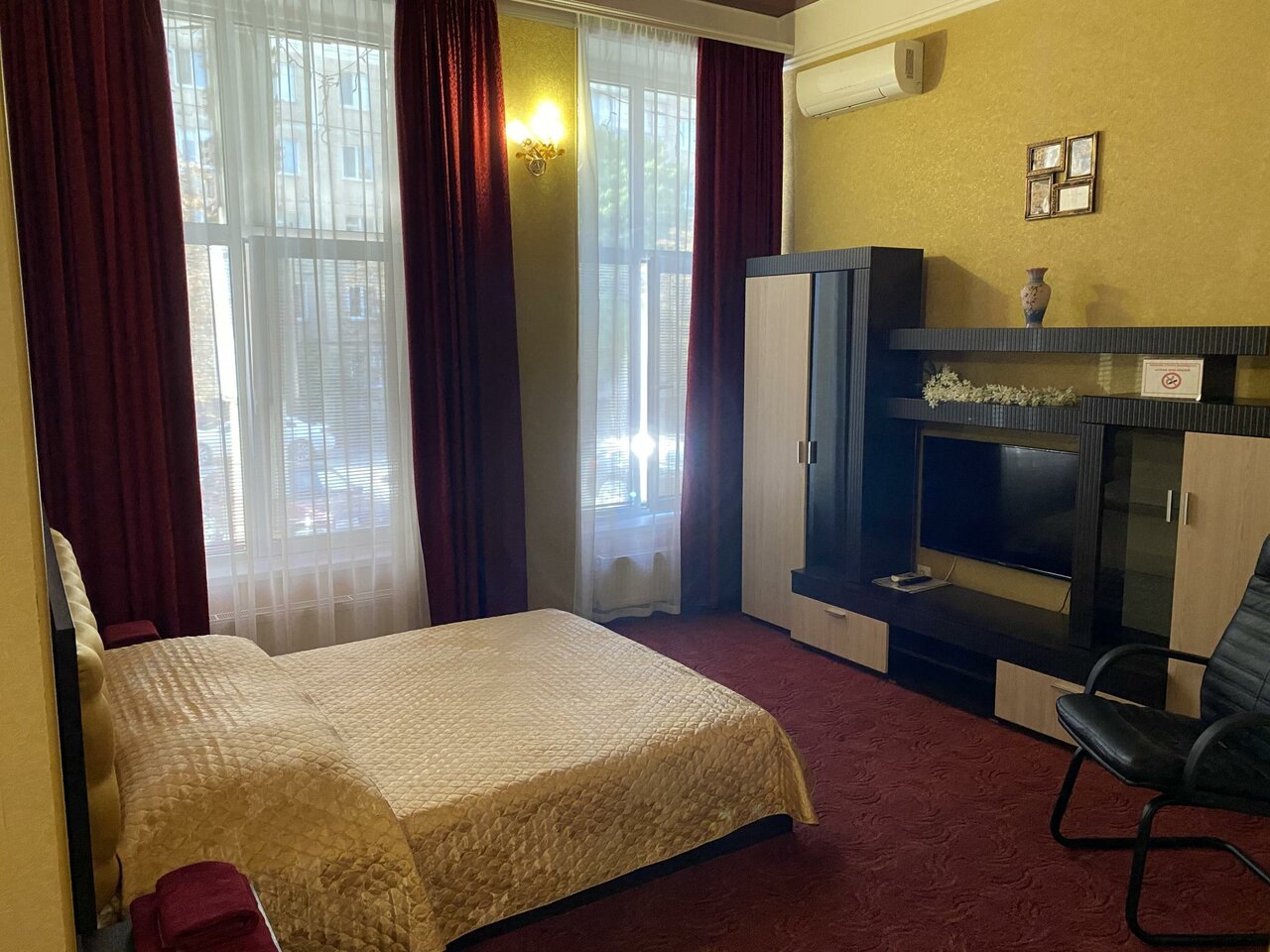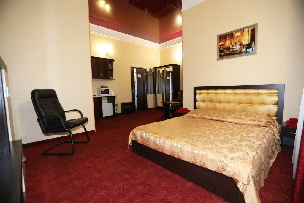 Просторный однокомнатный номер класса люкс выполнен в золотисто-бежевых и бордовых тонах, что создает атмосферу спокойствия и уюта.В номере имеется оборудованный кухонный уголок, посуда, електр. чайник, микроволновая печь, холодильник.