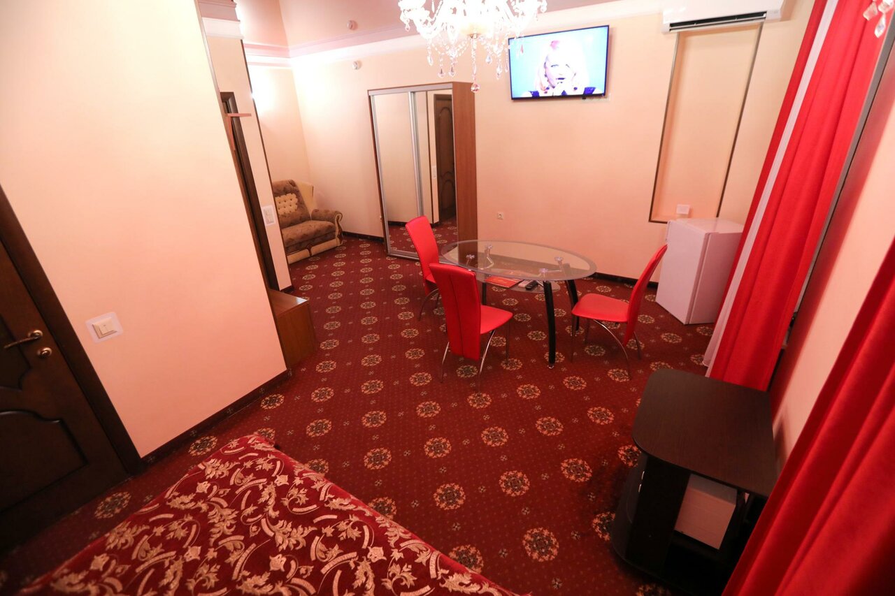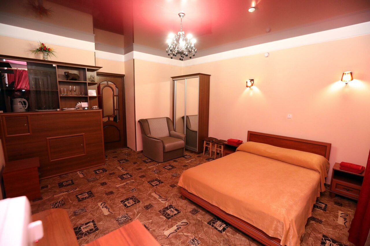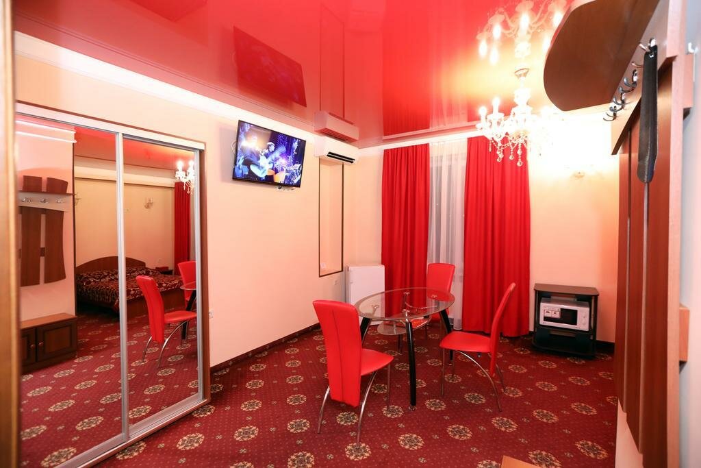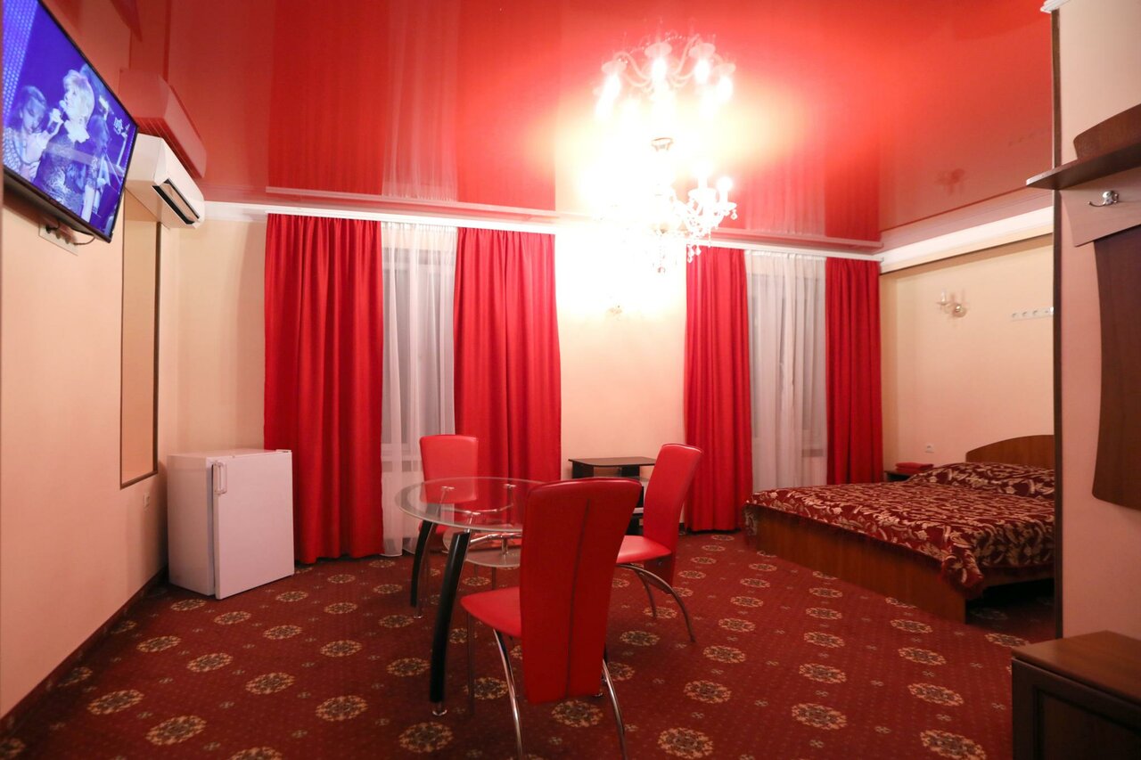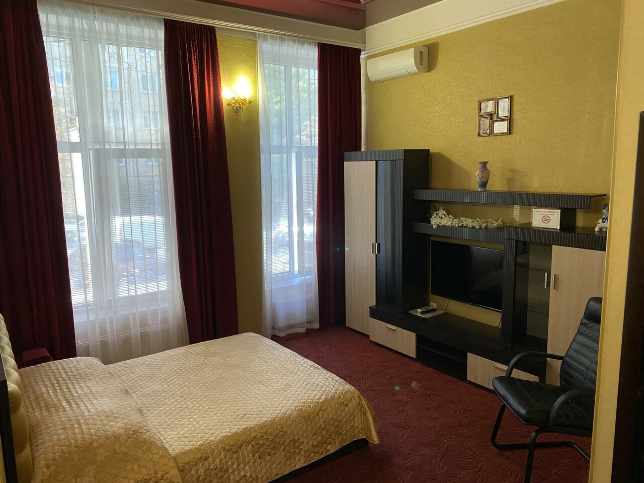 Просторный однокомнатный номер класса люкс выполнен в золотисто-бежевых и бордовых тонах, что создает атмосферу спокойствия и уюта.В номере имеется оборудованный кухонный уголок, посуда, електр. чайник, микроволновая печь, холодильник.