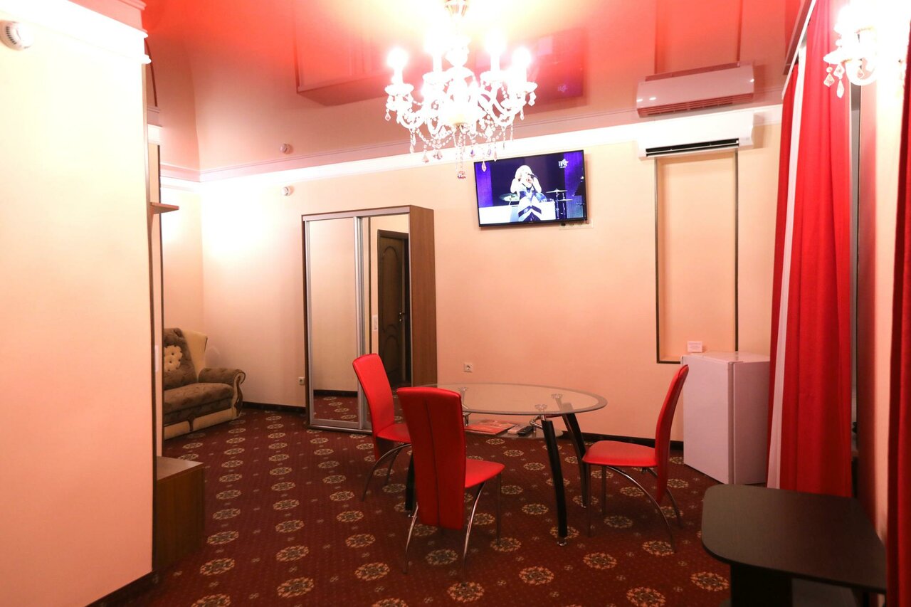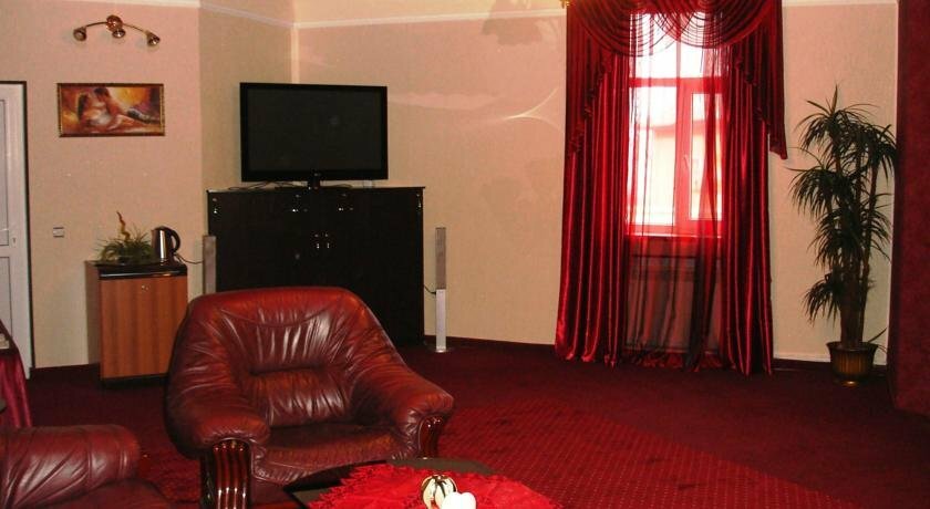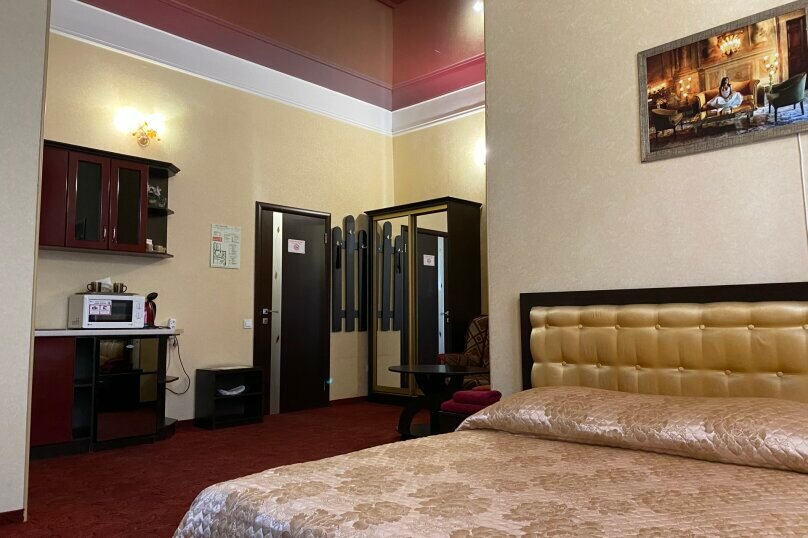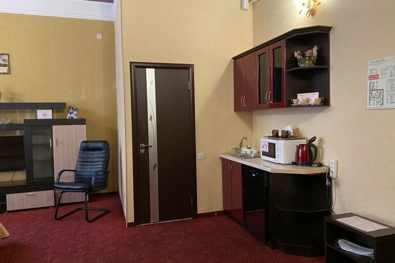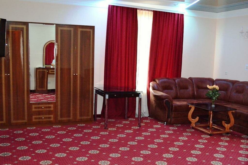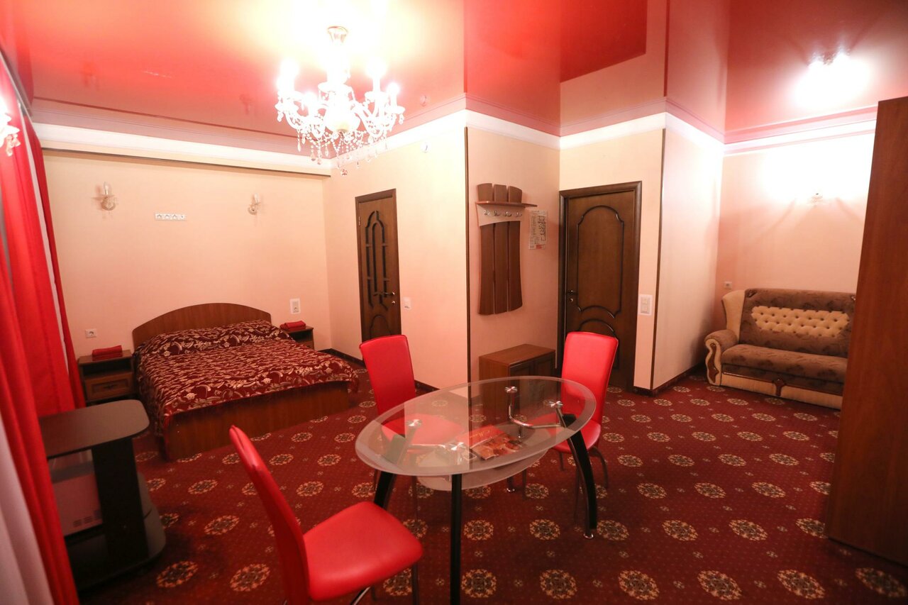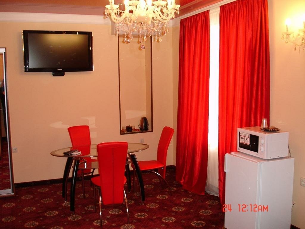 Просторный однокомнатный номер класса люкс выполнен в золотисто-бежевых и бордовых тонах, что создает атмосферу спокойствия и уюта.В номере имеется оборудованный кухонный уголок, посуда, електр. чайник, микроволновая печь, холодильник.