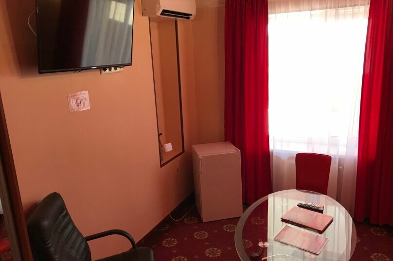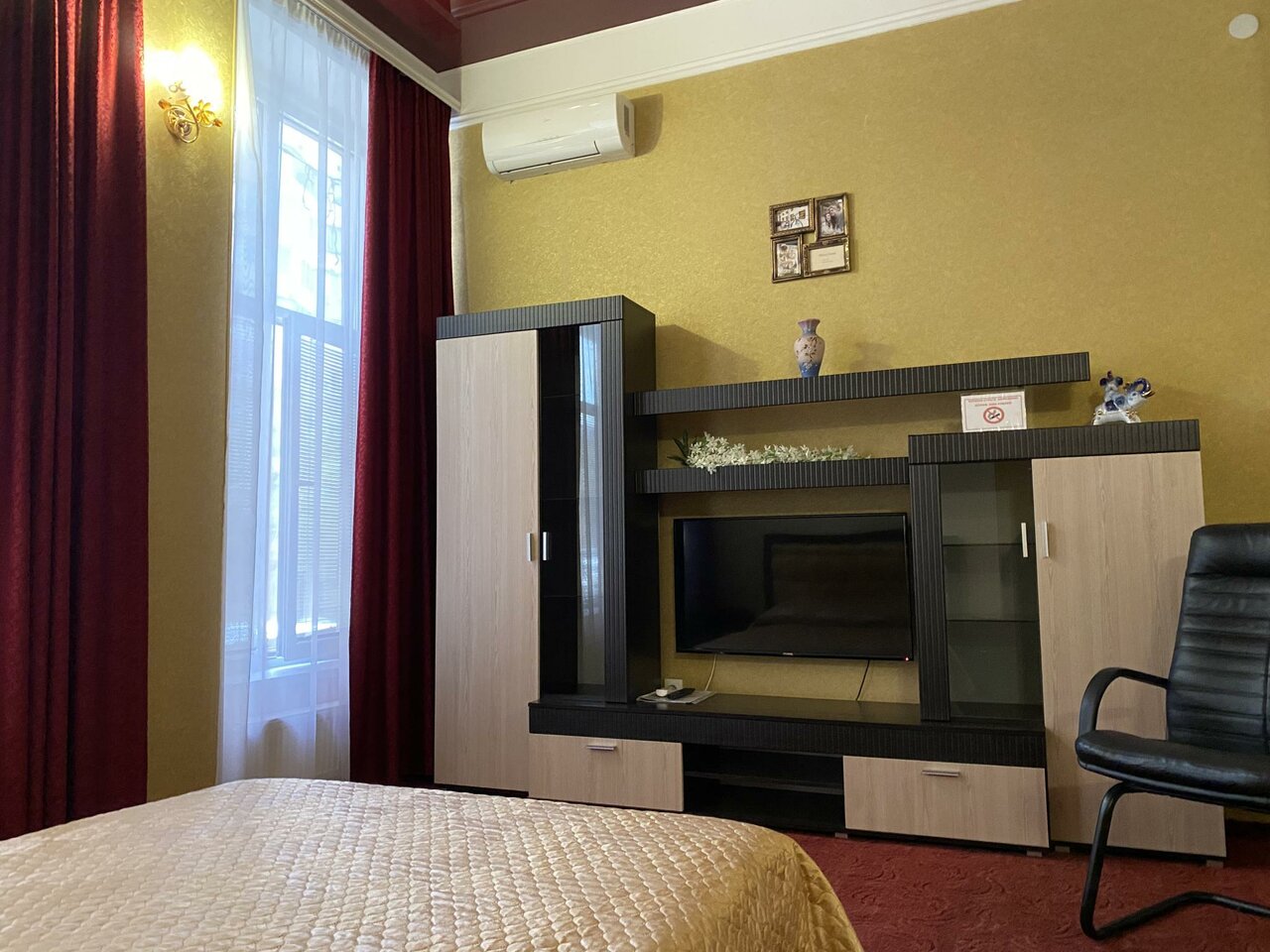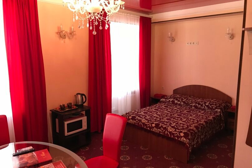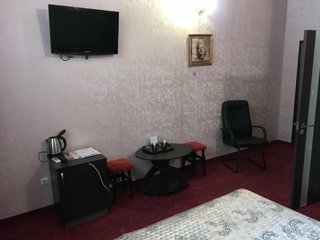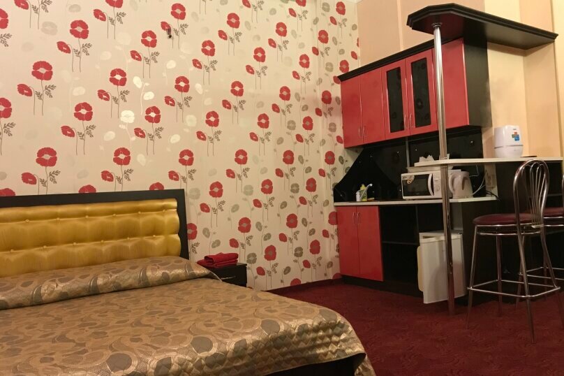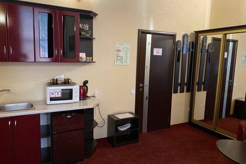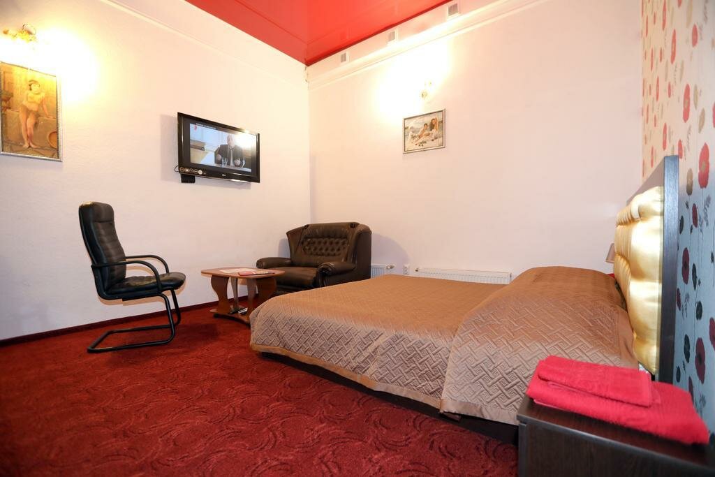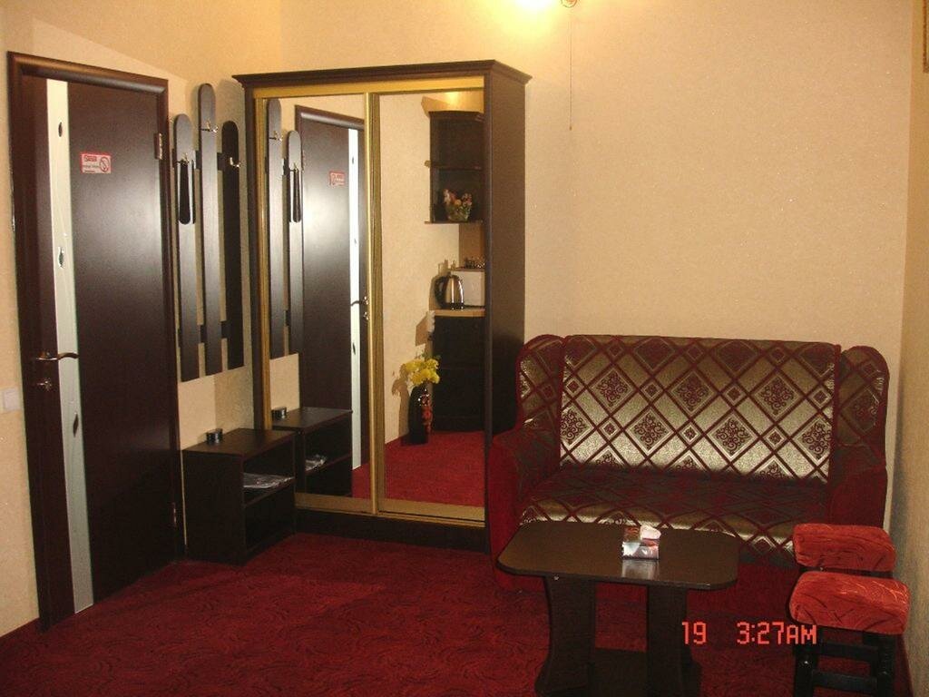 Просторный однокомнатный номер класса люкс выполнен в золотисто-бежевых и бордовых тонах, что создает атмосферу спокойствия и уюта.В номере имеется оборудованный кухонный уголок, посуда, електр. чайник, микроволновая печь, холодильник.