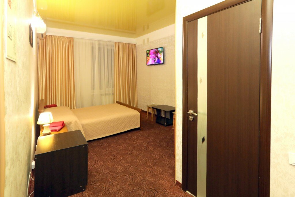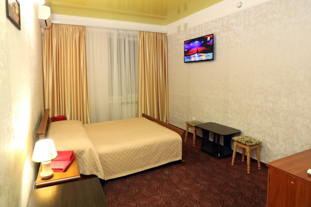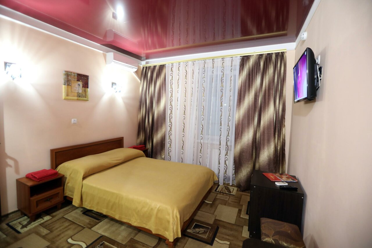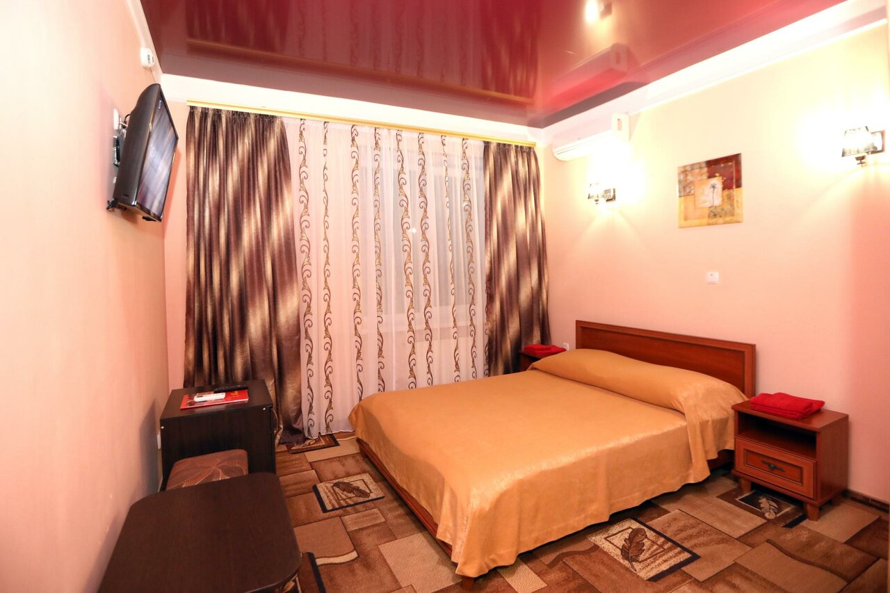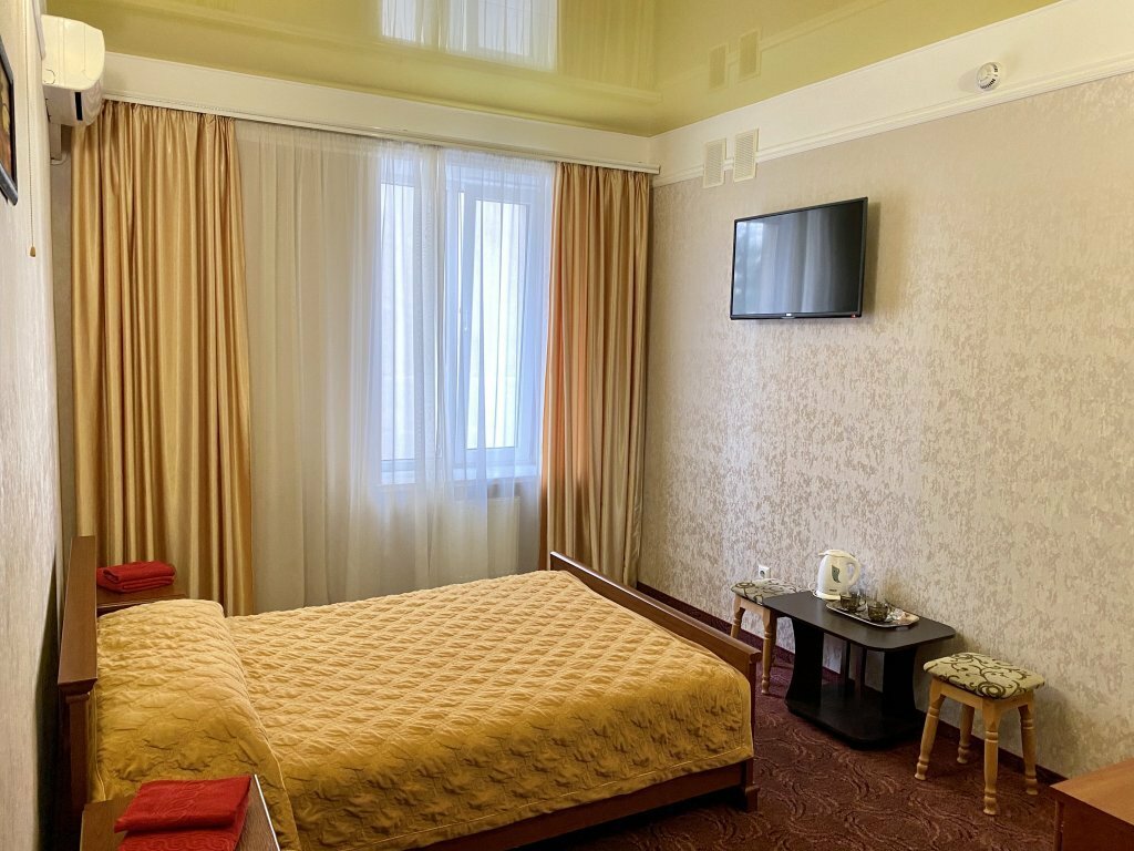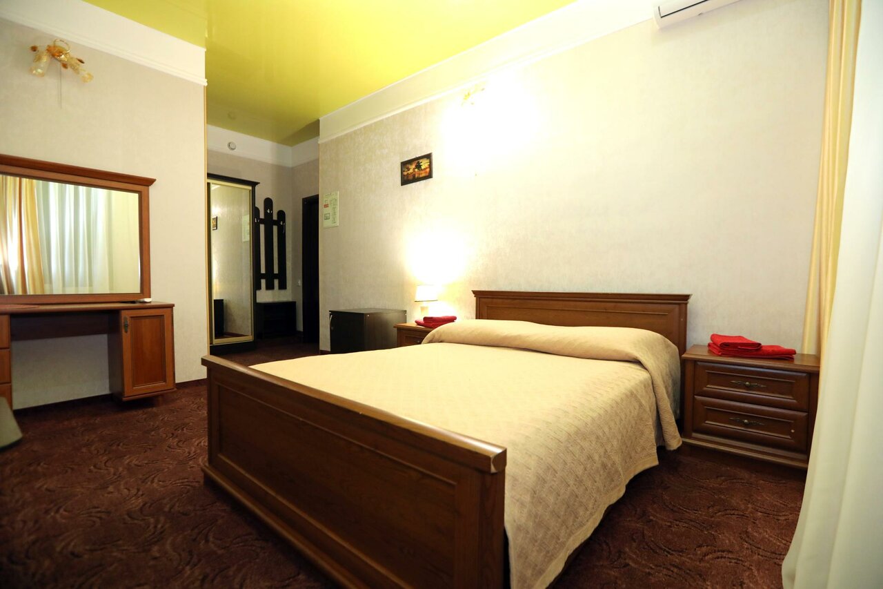 Однокомнатный уютный номер класса полулюкс сделает Ваш отдых по-настоящему комфортным и гармоничным. Приятно порадует сочетание желтого глянцевого потолка с золотисто-бежевыми обоями.