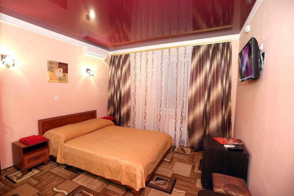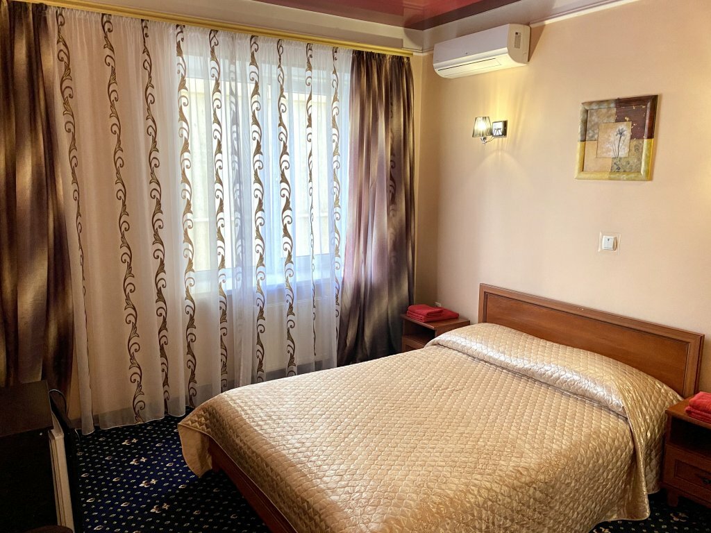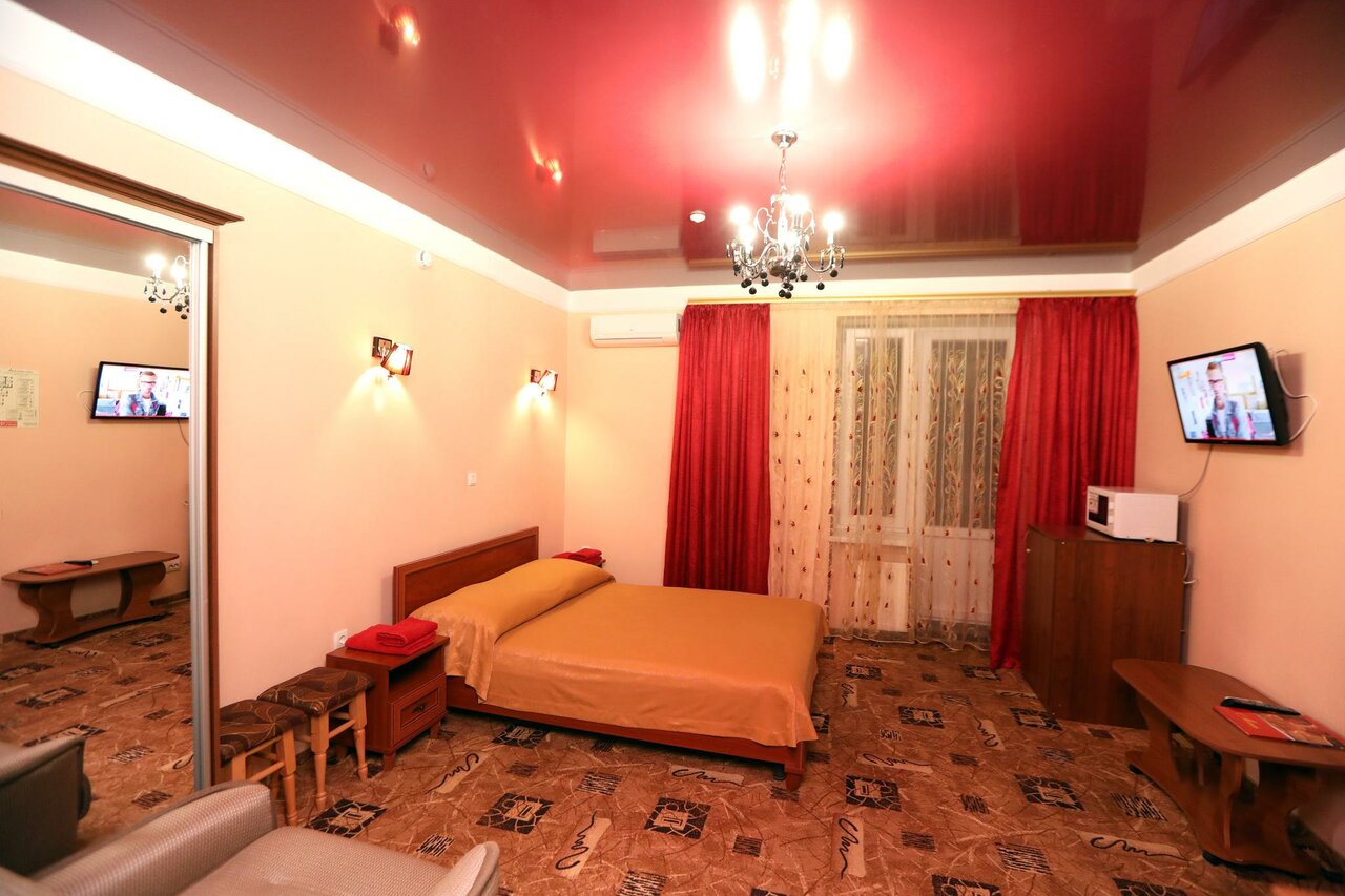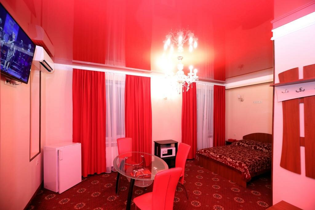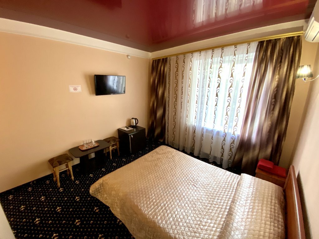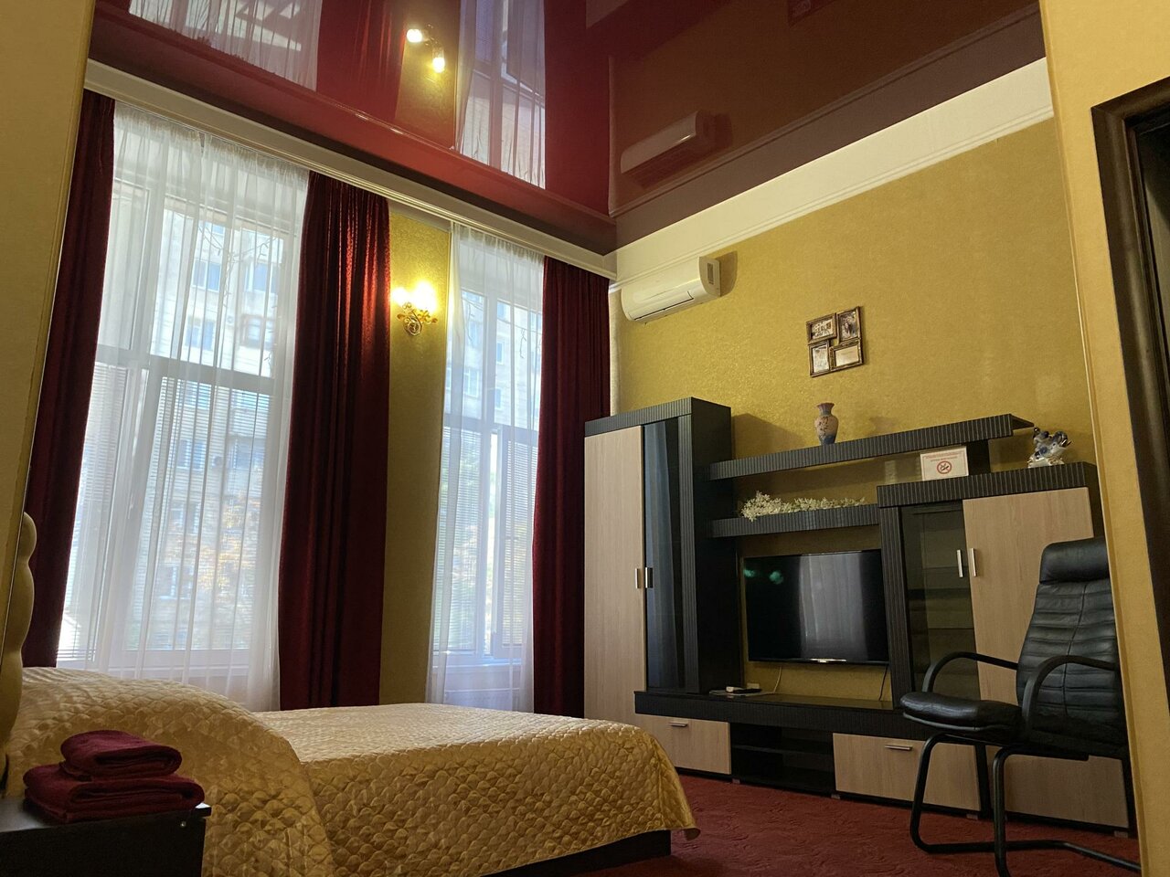 Однокомнатный уютный номер класса полулюкс сделает Ваш отдых по-настоящему комфортным и гармоничным. Приятно порадует сочетание желтого глянцевого потолка с золотисто-бежевыми обоями.
