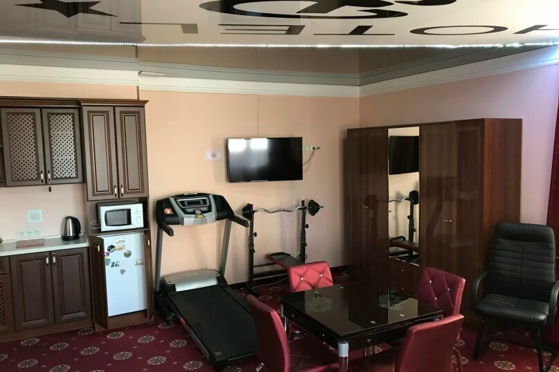Просторный номер с балконом и спортивным инвентарёмМини-кухня, двуспальная кровать, беговая дорожа, тренажер и т.д.