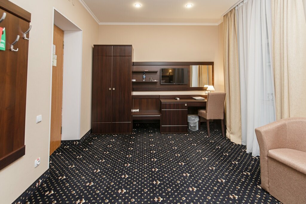 Оценка снижена за нежелание администрации посетить другие номера своей гостиницы, отличные от номеров с официального сайта. Грязный как асфальт ковролин, усталая мебель и техника. Швейцар откроет вам дверь, но далее никто не предложит вам перенести чемодан даже через ступеньку. Номер может быть на 4 этаже, лифта нет. Желаем гостинице скорейшего ремонта и обновлений. Терпели только потому, что в командировке и выбора не было. В остальном присоединяемся к хорошим словам предыдущих отзывов- красивое здание,в центре, охраняемая территория, ресторан прекрасный, обслуживание и питание на высшем уровне, шикарный холл, вежливые администраторы.