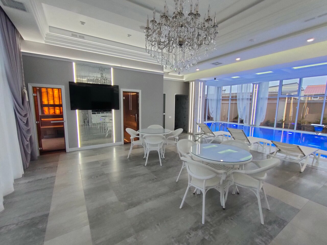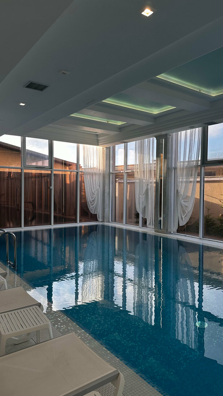 Большой, подогреваемый, крытый бассейн. Финская баня. Хамам. Банные принадлежности: полотенце, тапочки предоставят для Вас. Горячий чай, вода.
