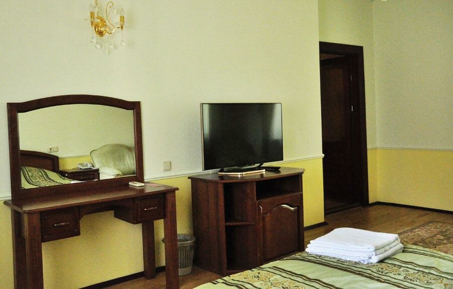 Уютный светлый номер с широкой двухспальной кроватью, идеально подходит как для отдыха, так и для бизнес-поездки. В номере есть телевизор, ванная комната, полотенца, халаты, чайник, холодильник. Завтрак входит в стоимость проживания.