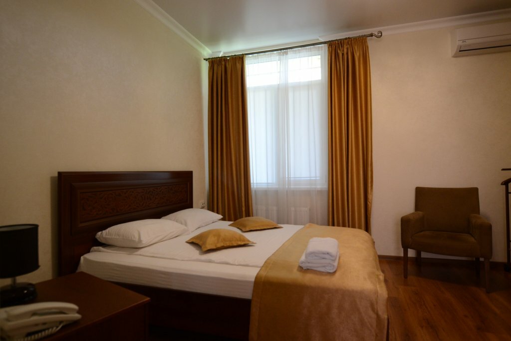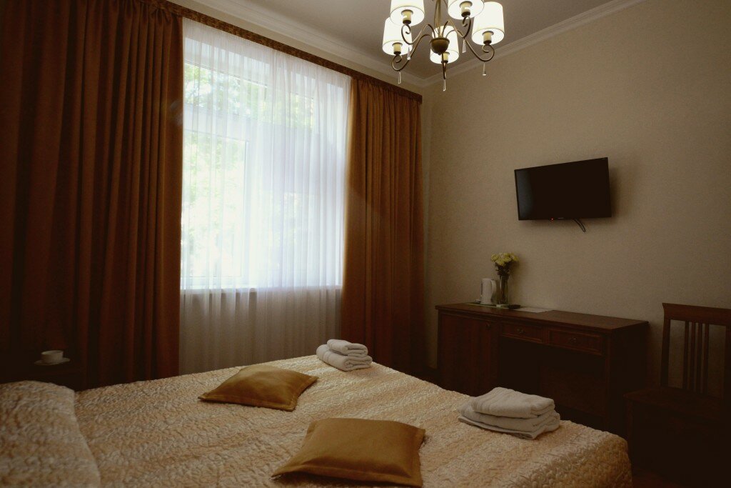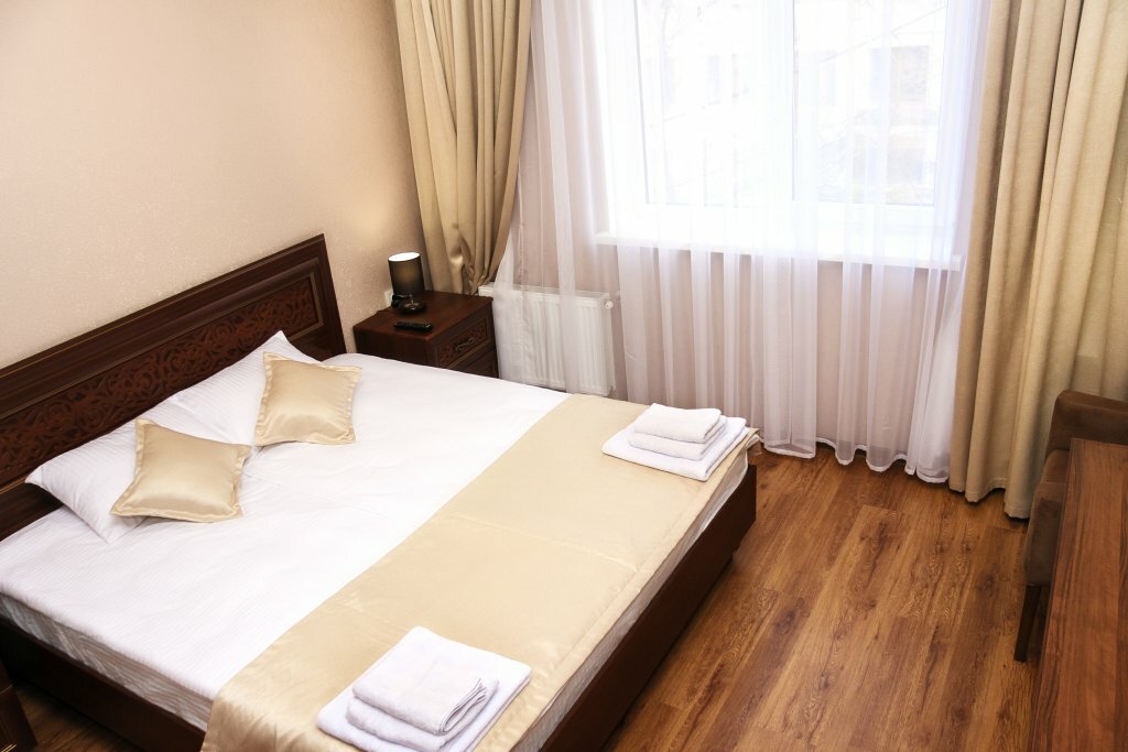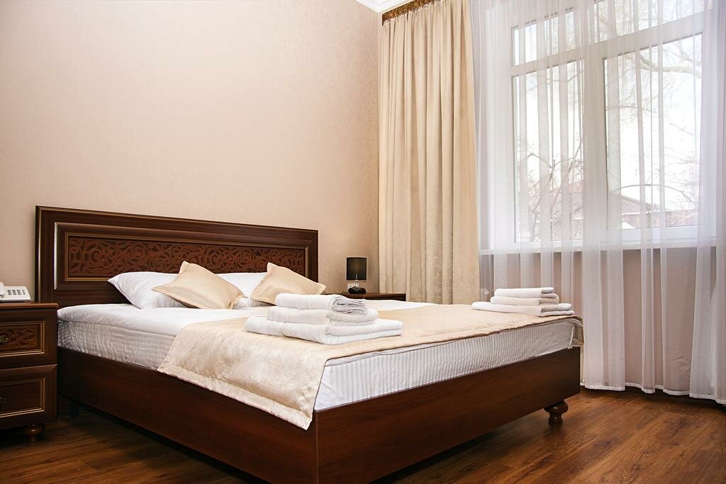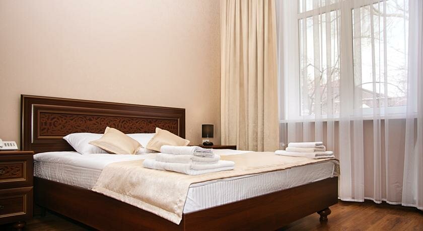 Уютный тихий отель в центре Симферополя. Номер просторный, чистый. Ванная комната с окном, все чисто, приятно. Вежливый и приятный персонал. Обильный завтрак. Парковка рядом с отелем. Также рядом с отелем шикарный ресторан Balkan grill, рекомендую обязательно посетить. Ночевали проездом из Нового Света в Мирный, прекрасно отдохнули.