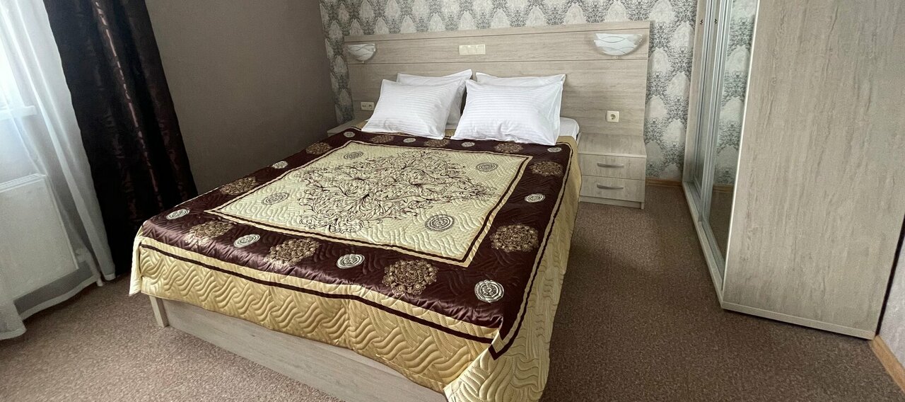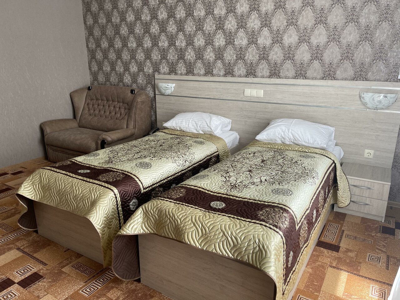 Комната прекрасно подойдет двум гостям, в туристической поездке или командировке. В ней будет особенно комфортно гостю с ребенком, которому требуется отдельное спальное место. При необходимости кровати сдвигаются в одну большую, двухместную.