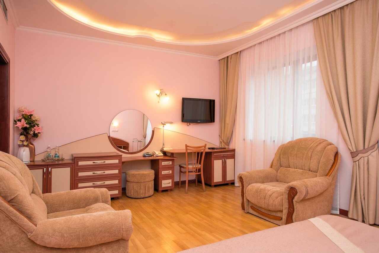Завтрак включен в стоимость. Одна двухспальная кровать с удобным ортопедическим матрасом, трюмо с пуфиком, рабочий стол, стул, два кресла, шкаф — купе. К услугам предоставляется телевизор с кабельным TV, бесплатный высокоскоростной интернет, телеф...