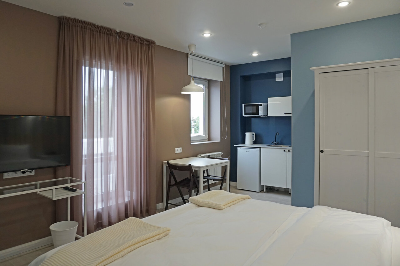 Останавливаюсь не в первый раз. Всё нравится — чистота, бельё, обстановка, тишина. Спасибо Артуру отдельное — настоящий хозяин отеля. В этом здании находятся Магнит, Аптека, короче всё необходимое. Номера оборудованы мини кухней, поэтому для командированного — это просто рай! Рекомендую. Следует знать, что ресепшн не круглосуточный, с 8 до 18.00, поэтому, в случае раннего или позднего заезда нужно созвониться с Артуром и договориться о встрече. У отеля собственная бесплатная парковка.
