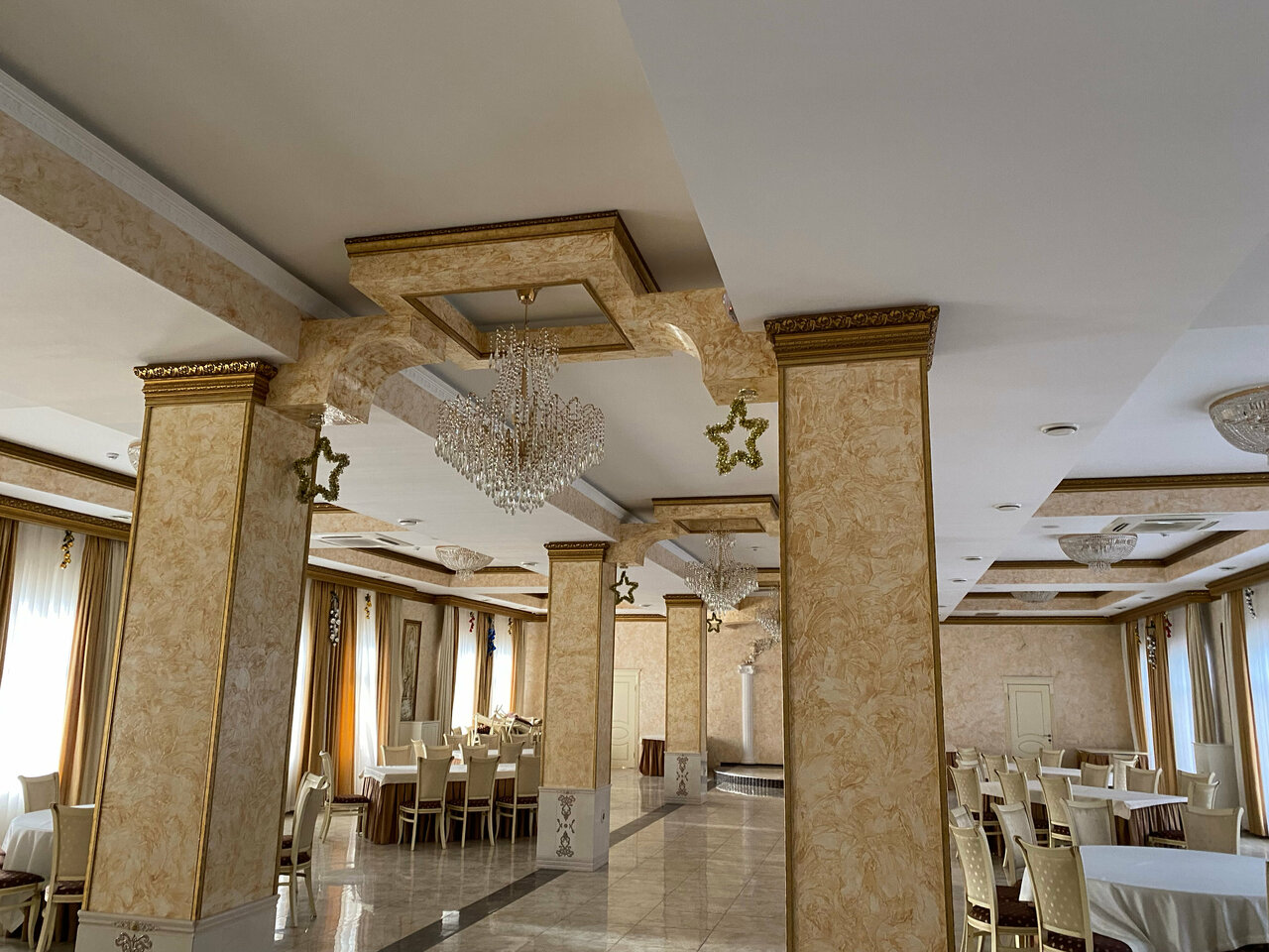 Номера чистые, гостиница красивая, интересное местоположение. Точно не 4 звезды,как заявляет гостиница. 4 звезды это по два полотенца на каждого гостя, халаты, тапочки не 1 пара для трехместного номера это точно. Завтрак так себе: гречка с сосиской, горошком и таким колличеством томата, как будто его украли и разделили на всех постояльцев. Зал ресторана красиво украшен, это действительно так.