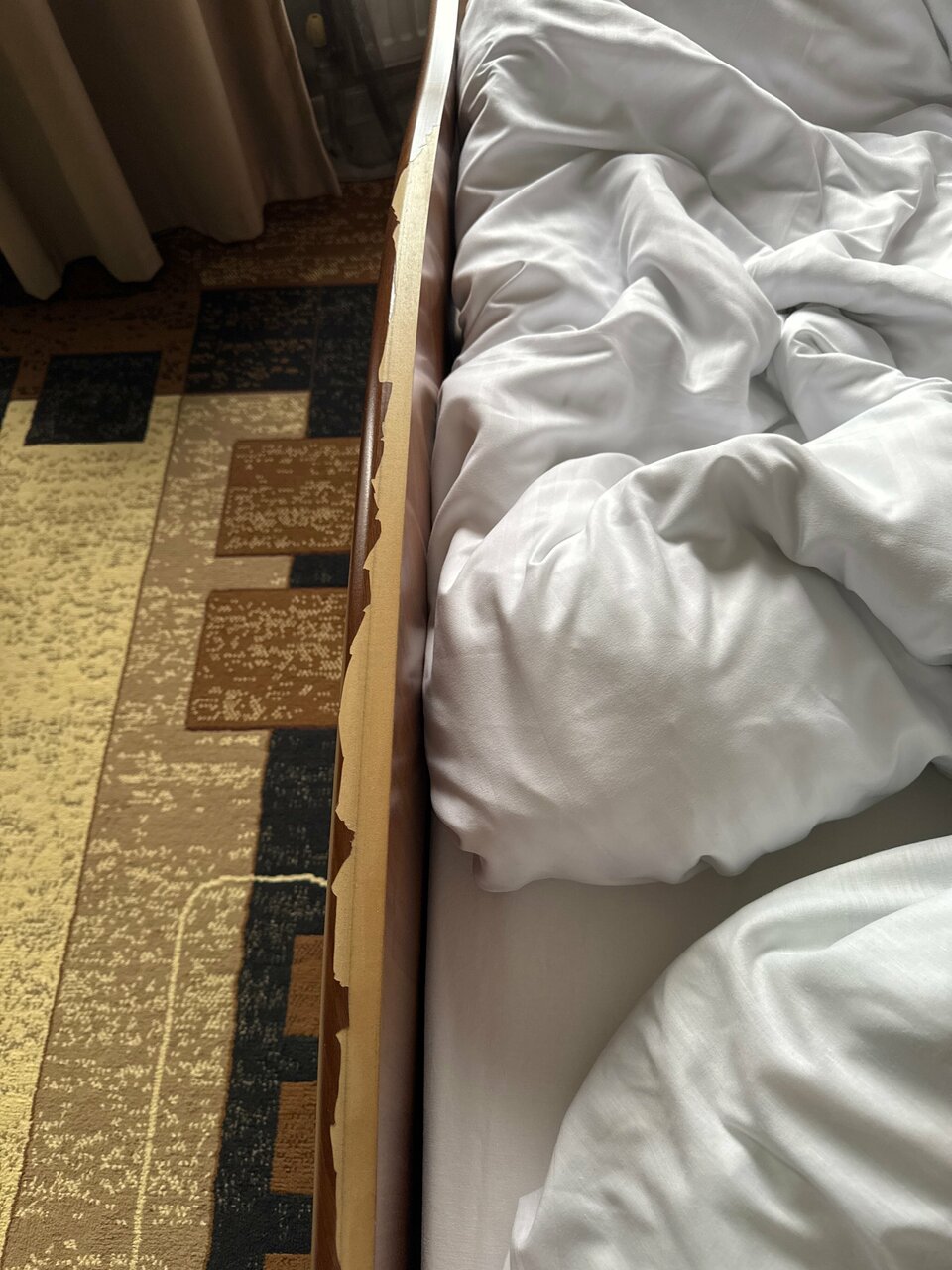 Снаружи вроде всё ничего, но в мелочах… Одеяло в пятнах, трап в душе не сливает воду и так во всем