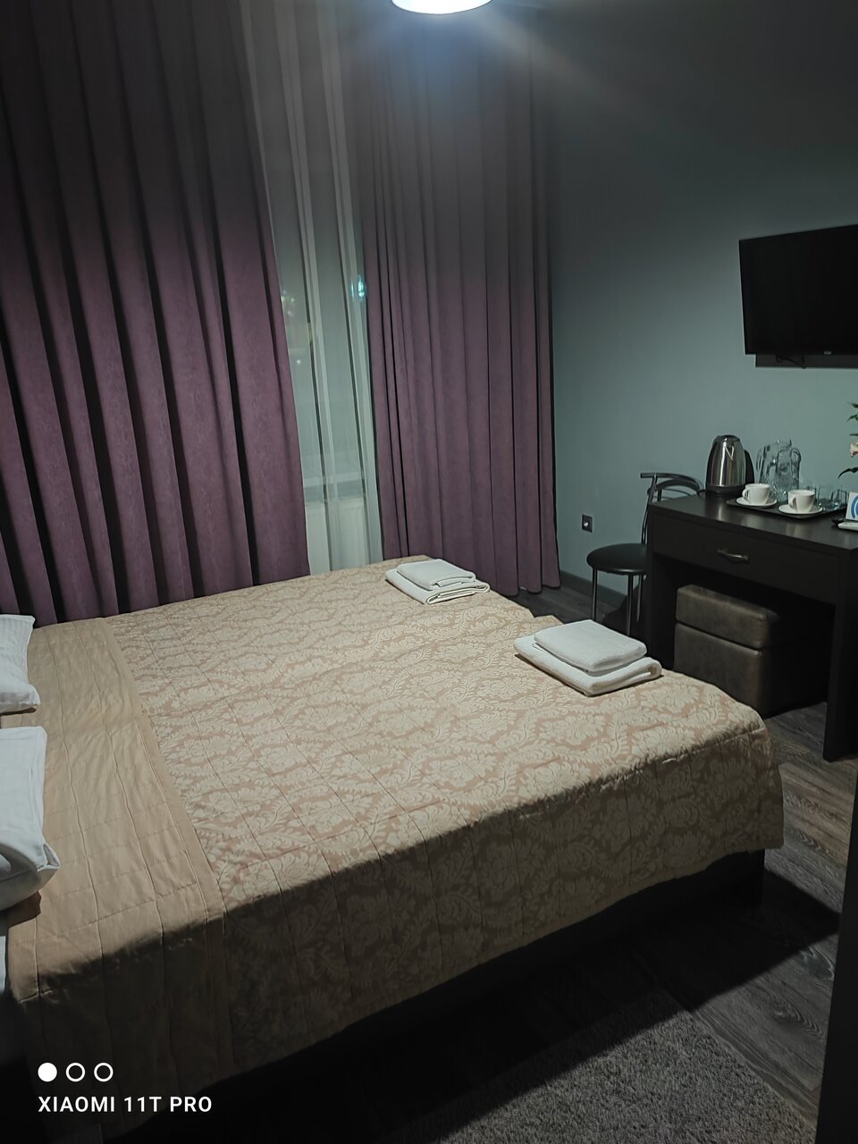 Отличная гостиница. В номере чистото, белоснежные простыни, полотенца. Для ног есть небольшие полотенчики, кстати это очень удобно. Номер просторный, в нём две кровати, прикроватные тумбочки, шкаф для одежды, два стула, холодильник чайник, стаканы, графин, одноразовые ложки. В туалете чисто, имеется освежитель воздуха, туалетная бумага, мыло. Я ставлю твёрдую пятёрку! Цена для июля 2200 это приемлемо. Гостиница находится на выезде из города, это очень удобно! Рекомендую.