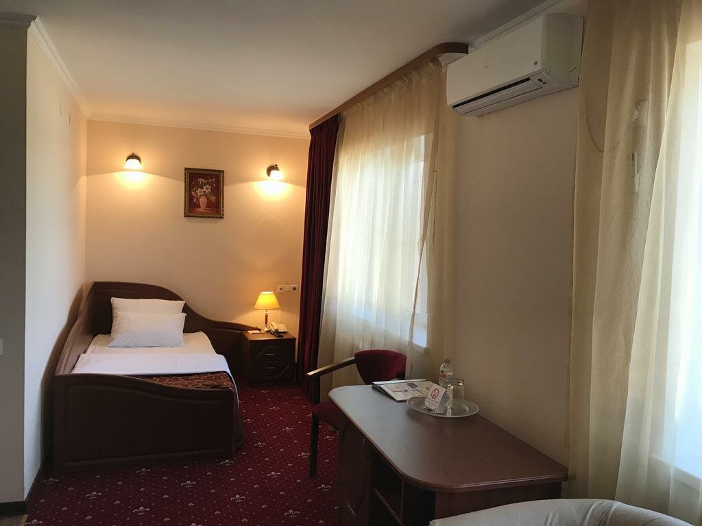 На 3-звёздочный отель вполне тянет. Стоянка для авто есть, но не большая. Одноместный номер, где я был, нормальный. ТВ, кондей, окно с москитной сеткой. Санузел с ванной, а не с душевой кабинкой. Есть внутренний телефон для вызова персонала и звонков в др. номера.