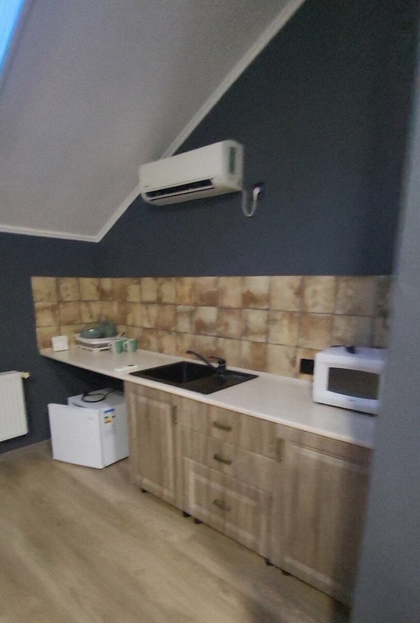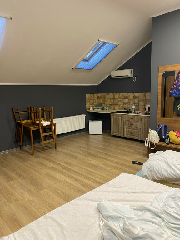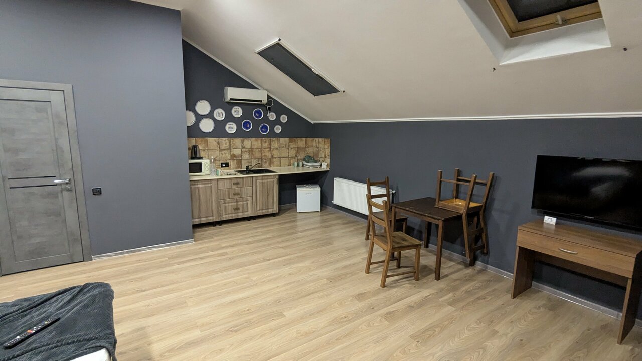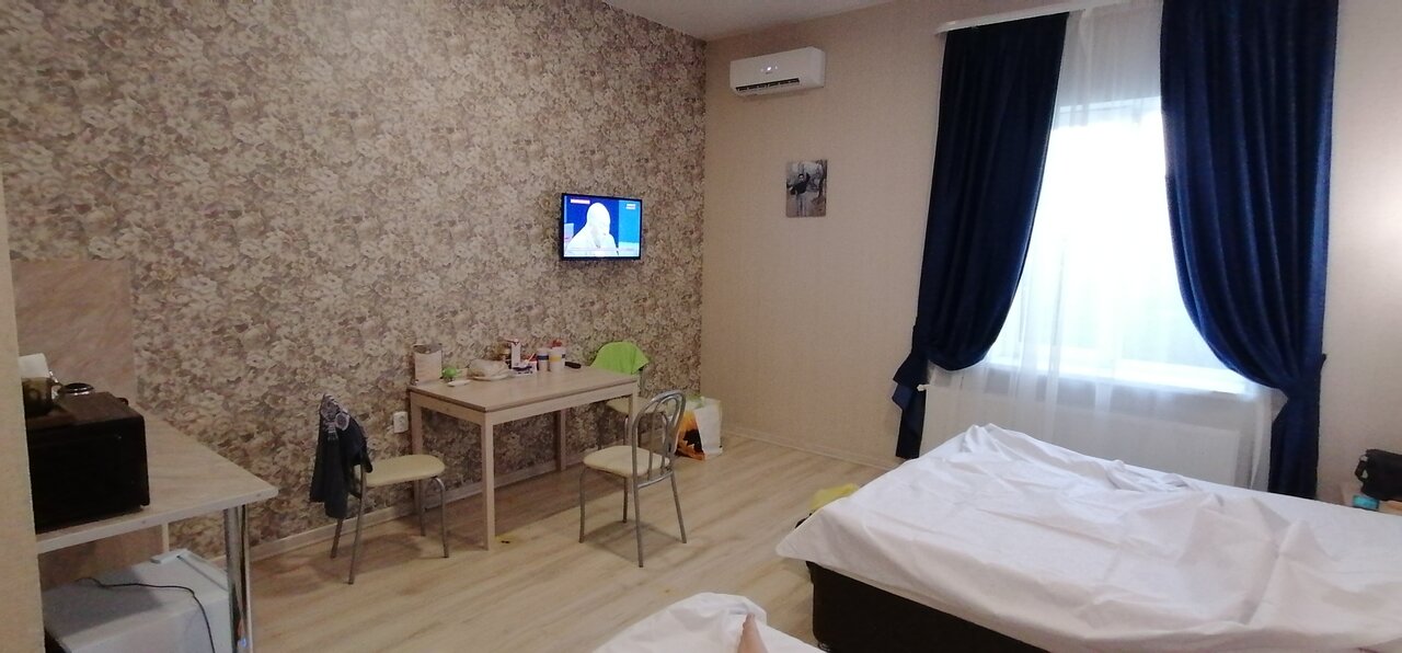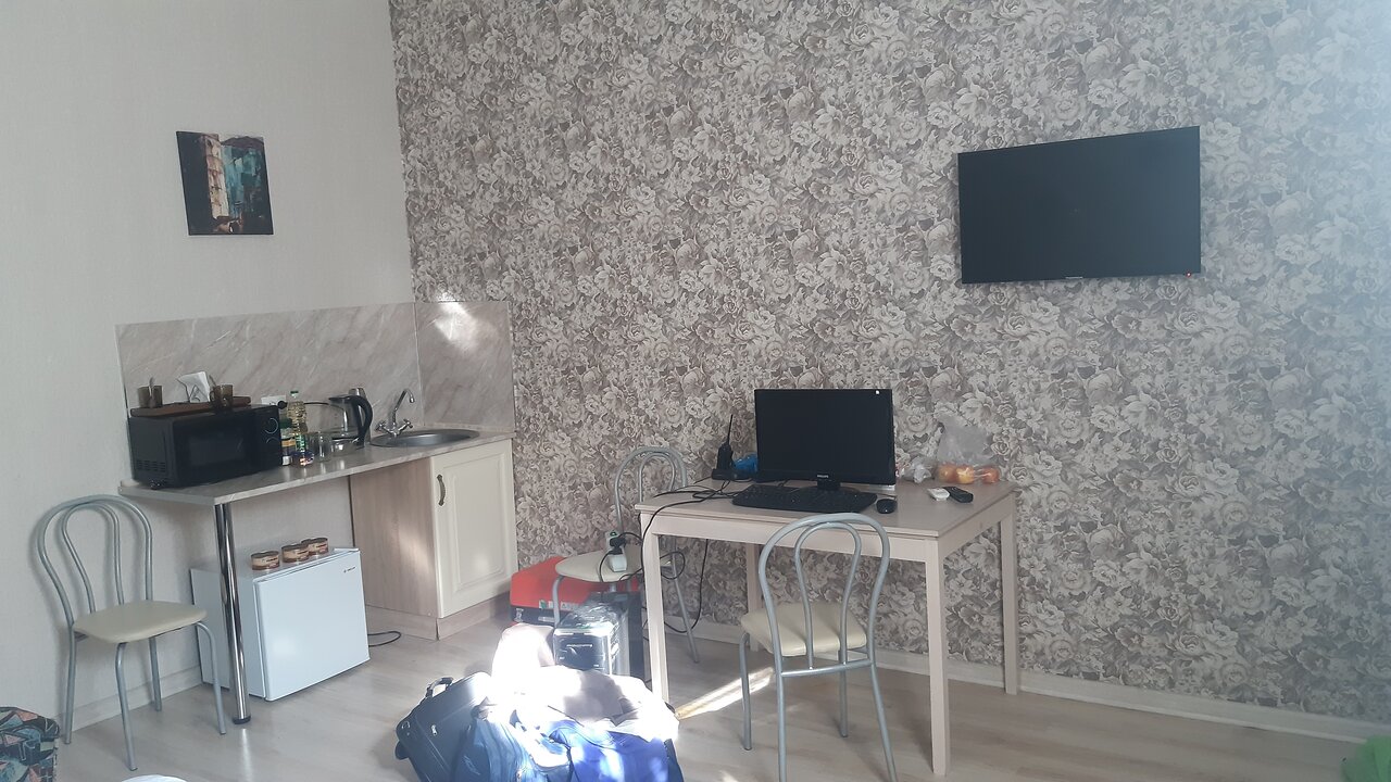Очень хорошие апартаменты мы сняли для отдыха на троих на ночь ! Огромная комната , большая двухспальная кровать и односпальная !!! Стол , стулья , шкаф , телевизор , холодильник, кондиционер, кухонный гарнитур , микроволновая печь и вся посуда ! Отличный санузел ! Задумка по дизайну очень хорошая ! Правда качество исполнения немного подвело! Но мы замечательно переночевали ! Желаю хозяевам найти профессионалов и подправить ремонт !!!