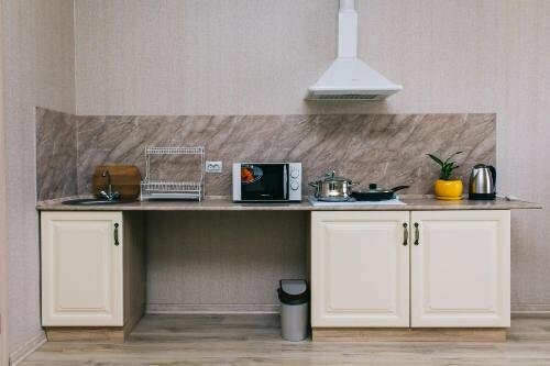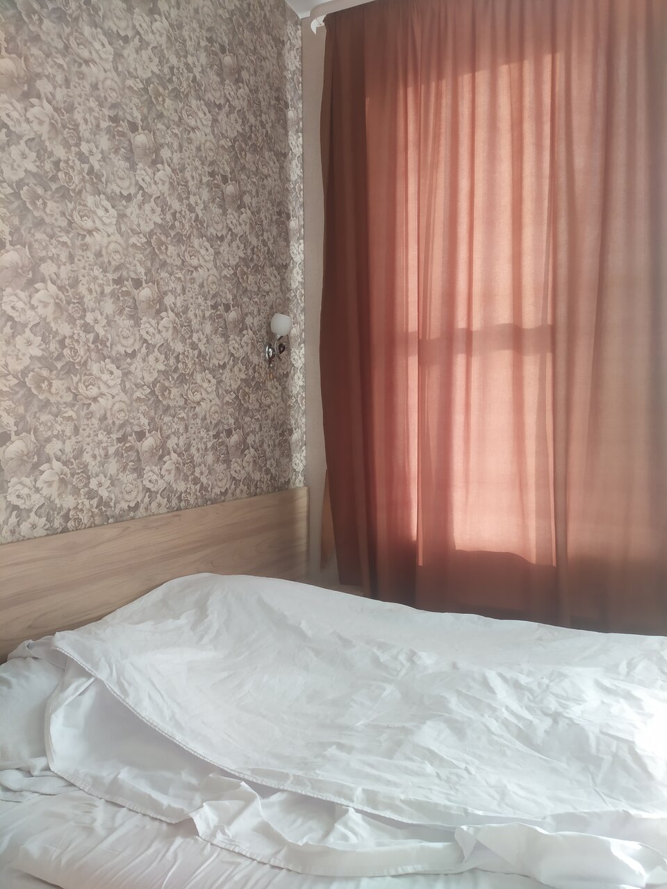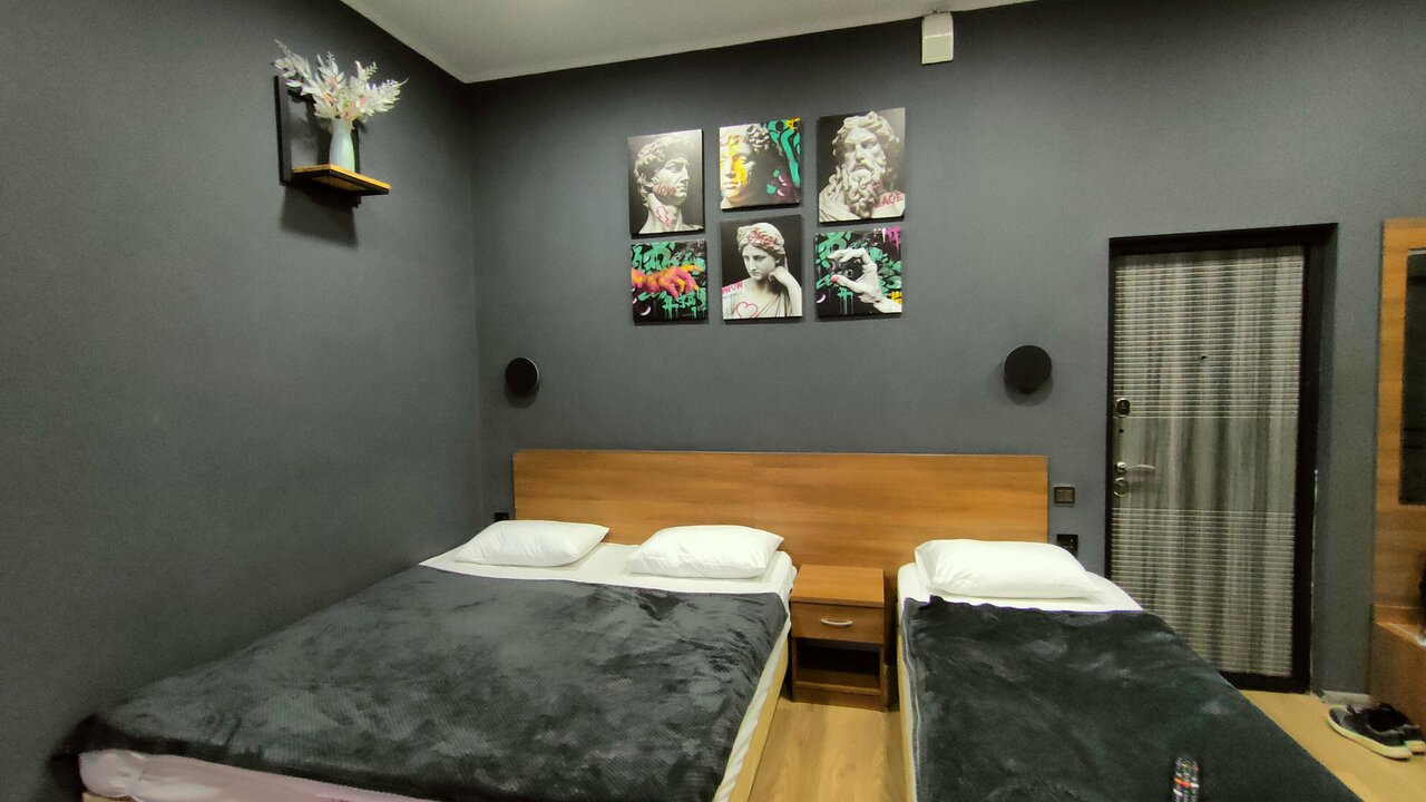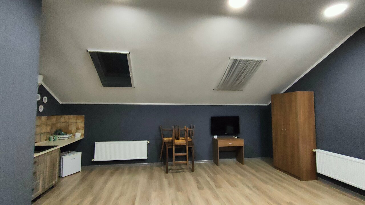 Очень хорошие апартаменты мы сняли для отдыха на троих на ночь ! Огромная комната , большая двухспальная кровать и односпальная !!! Стол , стулья , шкаф , телевизор , холодильник, кондиционер, кухонный гарнитур , микроволновая печь и вся посуда ! Отличный санузел ! Задумка по дизайну очень хорошая ! Правда качество исполнения немного подвело! Но мы замечательно переночевали ! Желаю хозяевам найти профессионалов и подправить ремонт !!!