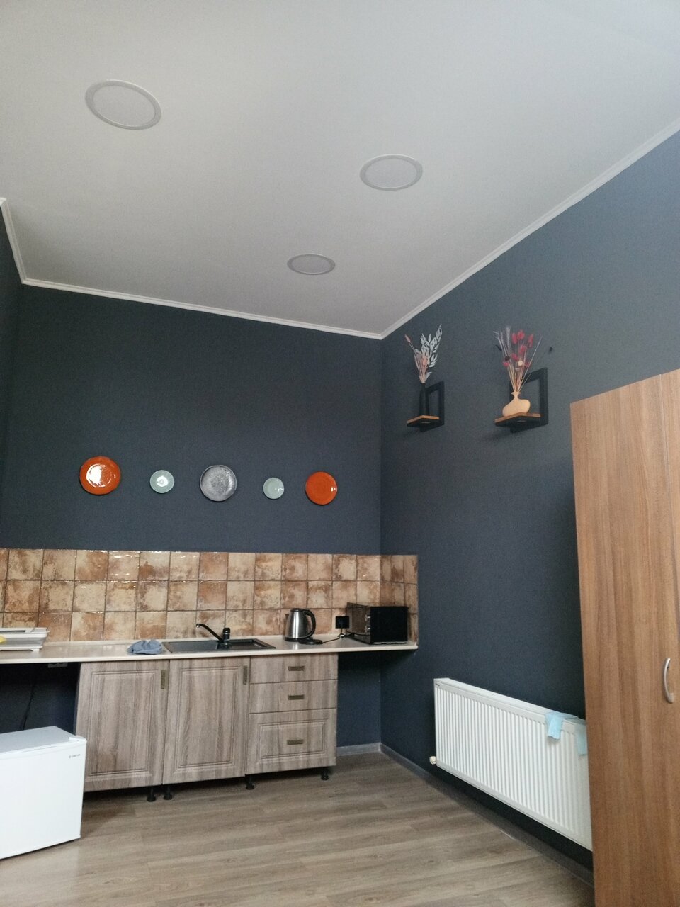 - Мини-кухня с посудой, микроволновкой, чайником, холодильником (в некоторых номерах даже плита).