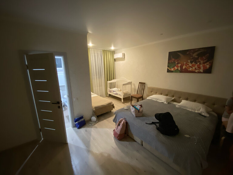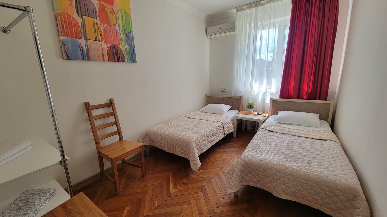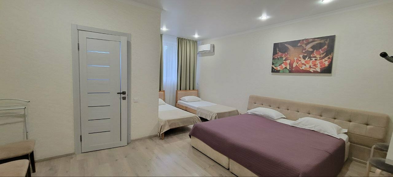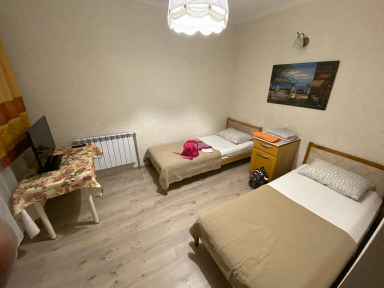 Стандартный 4-х местный семейный номер. В номере есть 3 односпальных кровати + 1 большой диван, стол, телевизор шкаф, свой сан.узел, и большая общая кухня.