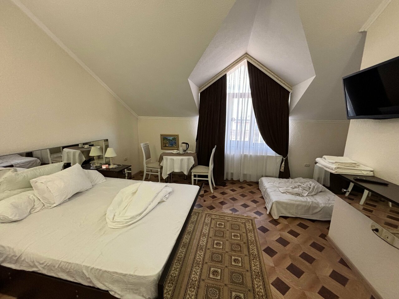 Очень чисто, действительно чистый номер! Бронировали день в день на 4х (2-ое взрослых и 2-ое детей), 1 большая кровать, 1 маленький диван, все застелено. В номере есть стол, 2стула, 2 тумбы, телевизор (хорошо ловит каналы, все настроено), одноразовые тапочки, полотенца, гели/шампуни/зубные щетки, чашки, чай. Есть минус, но непосредственно к номеру он не относится: завтраков нет. За одну ночь заплатили 4000