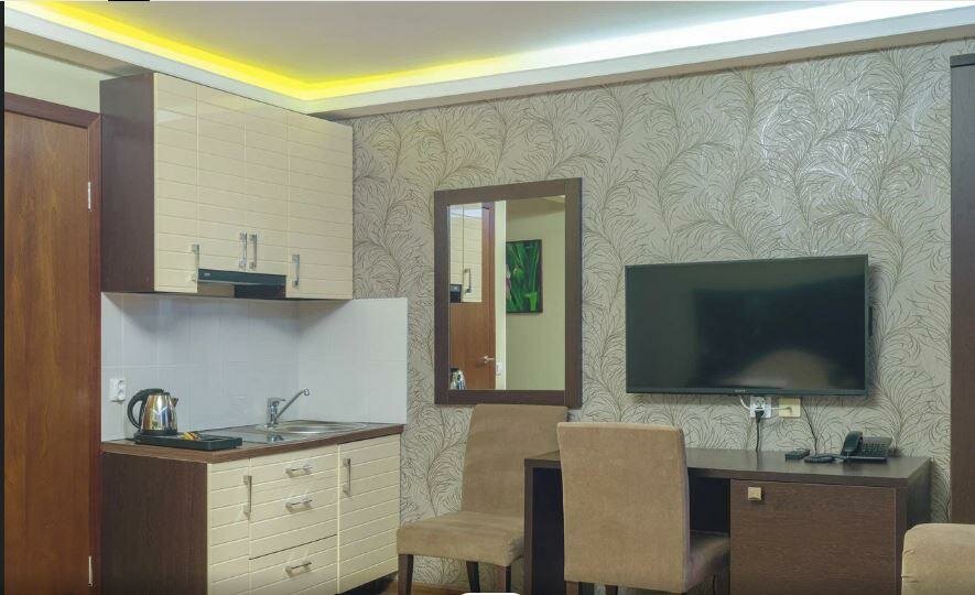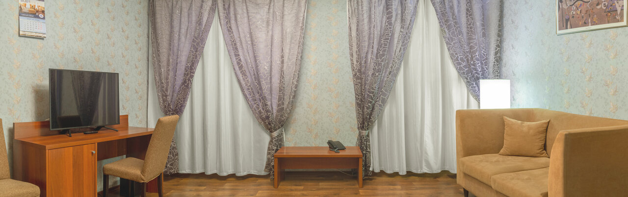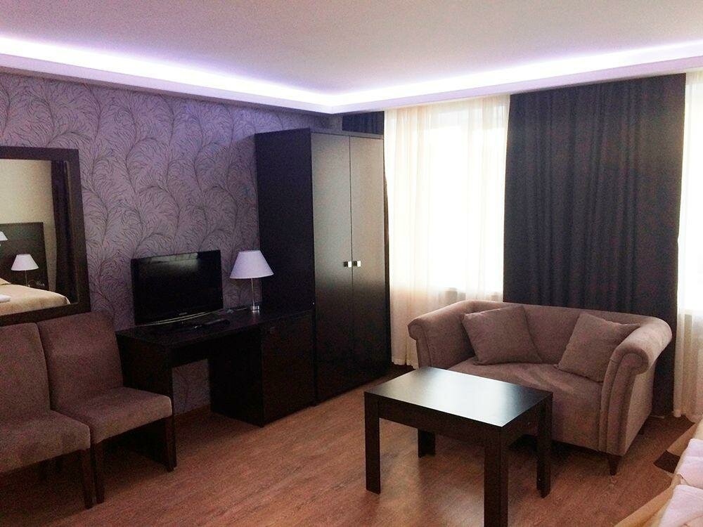- В номерах люкс:новый ремонт, тёплые полы, большой телевизор, чайник, холодильник, халаты.