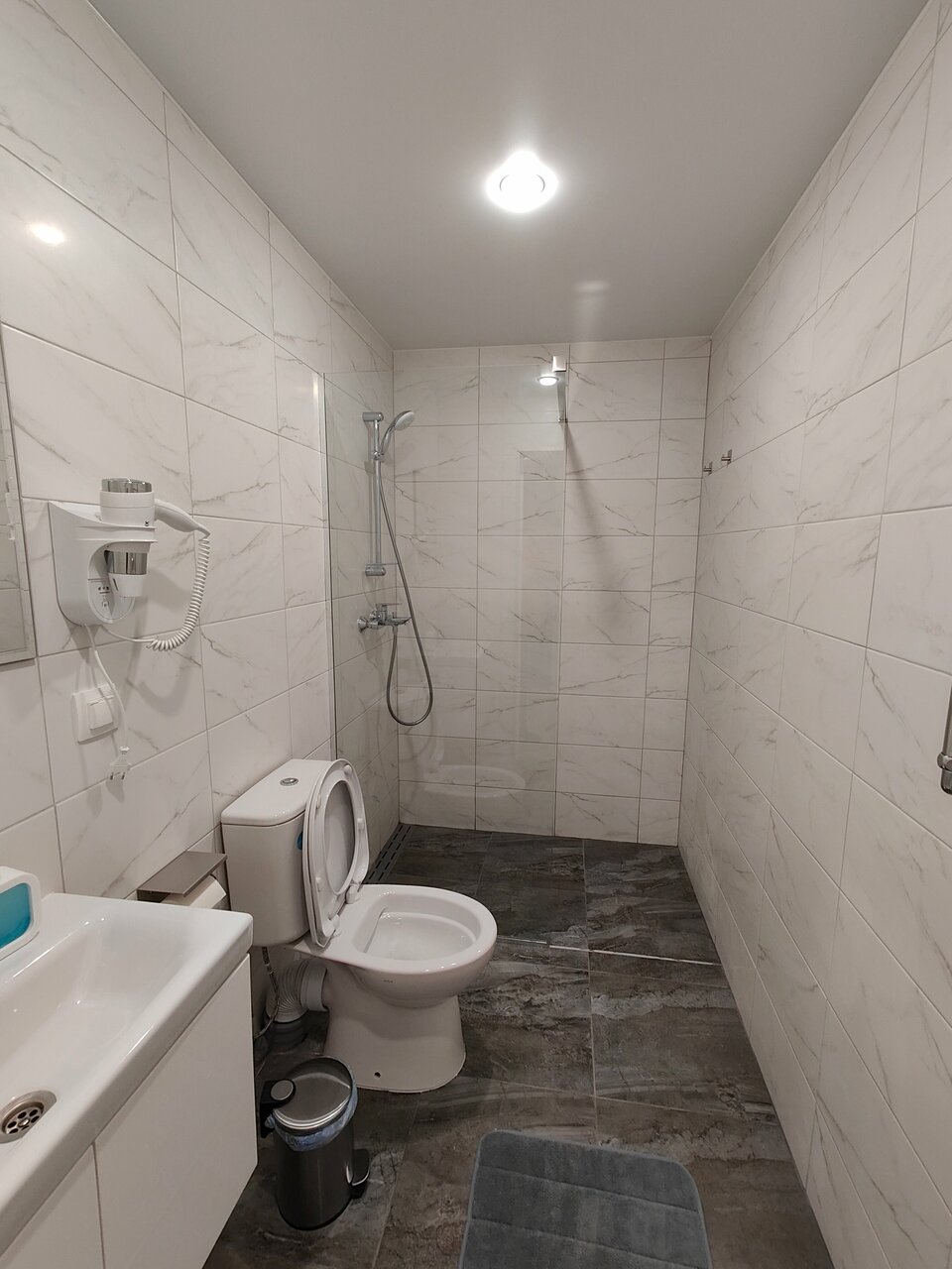 - Удобная планировка (отдельный душ, туалет, теплые полы).