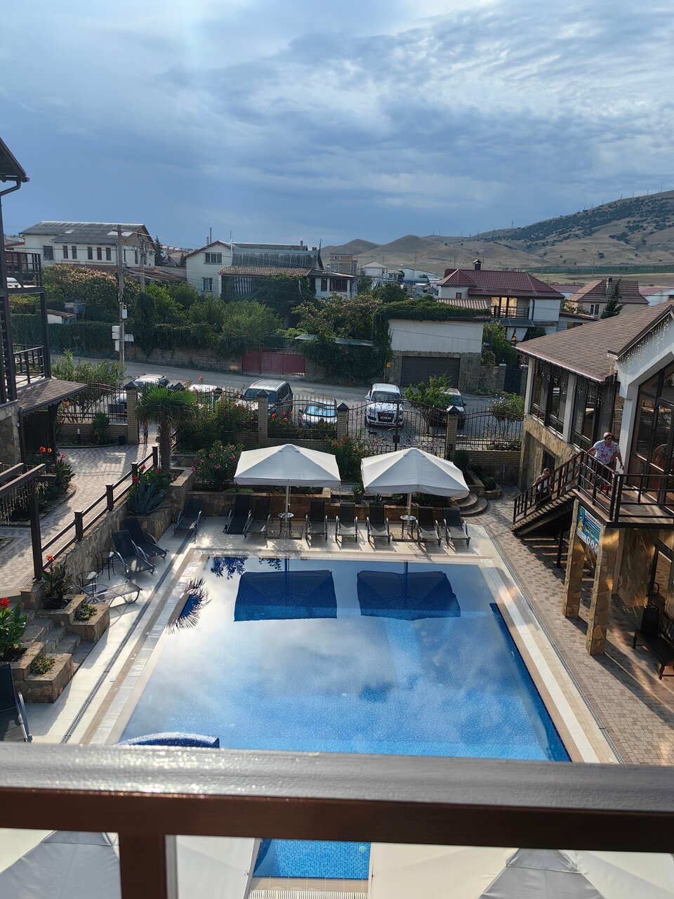 Отличный отель! Уютный, чистый, прекрасный энтерьер и очень радушный персонал. А виды из номера на мыс Меганом просто бомбический! Рекомендую для тихого семейного отдыха.