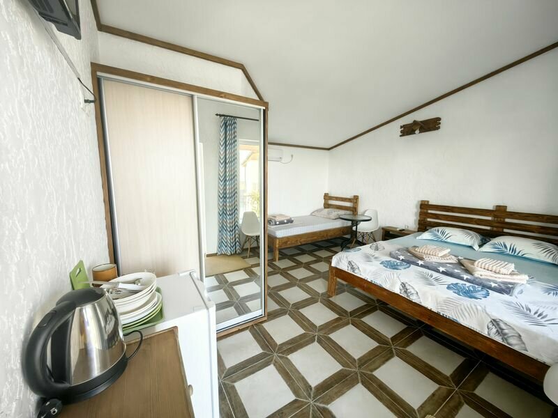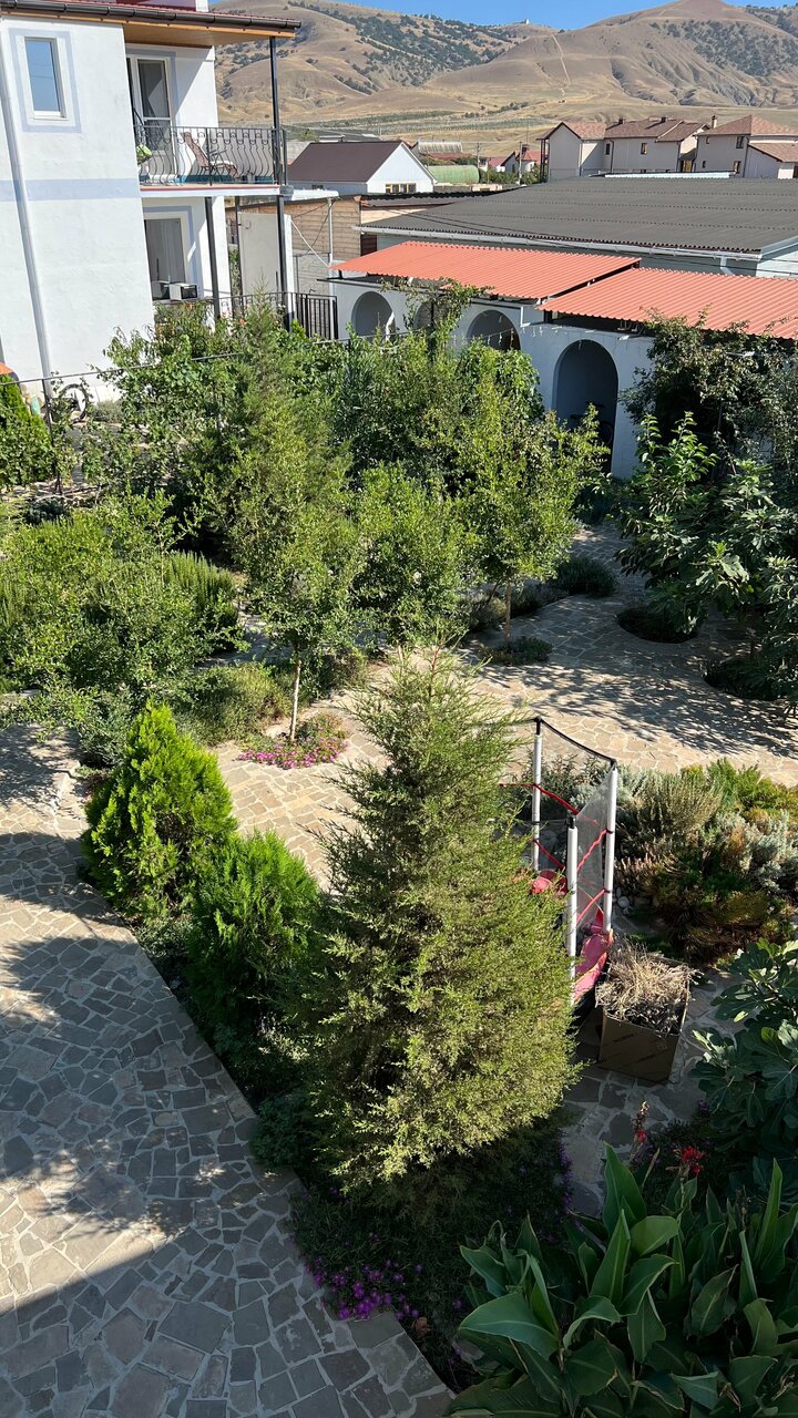 В греческом стиле дом и дворик с беседками, интересные входы выходы, лестницы, терраски, балконы с красивейшими видами. Белье, полотенца новое чистое, посуда индивидуальная своя , чайник в номере, большие деревянные кровати массивные, новые ванные комнаты. Близко к самым хорошим пляжам Меганом и Устричный. До входа в Тавриду пешком 5 минут. Приезжали на фестиваль, прекрасно отдохнули.