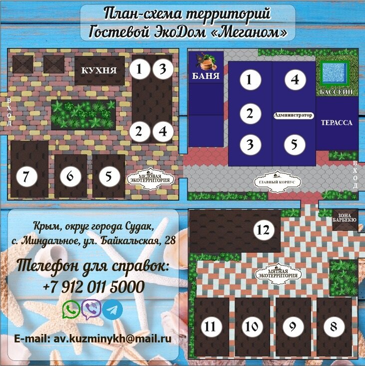 Гостевой эко-дом «Меганом» находится по адресу: Республика Крым в округе города Судак, с. Миндальное ул. Байкальская 28, Телефон для справок и бронирования дома/номера: +7(912)011-5000 либо пишите в WhatsApp