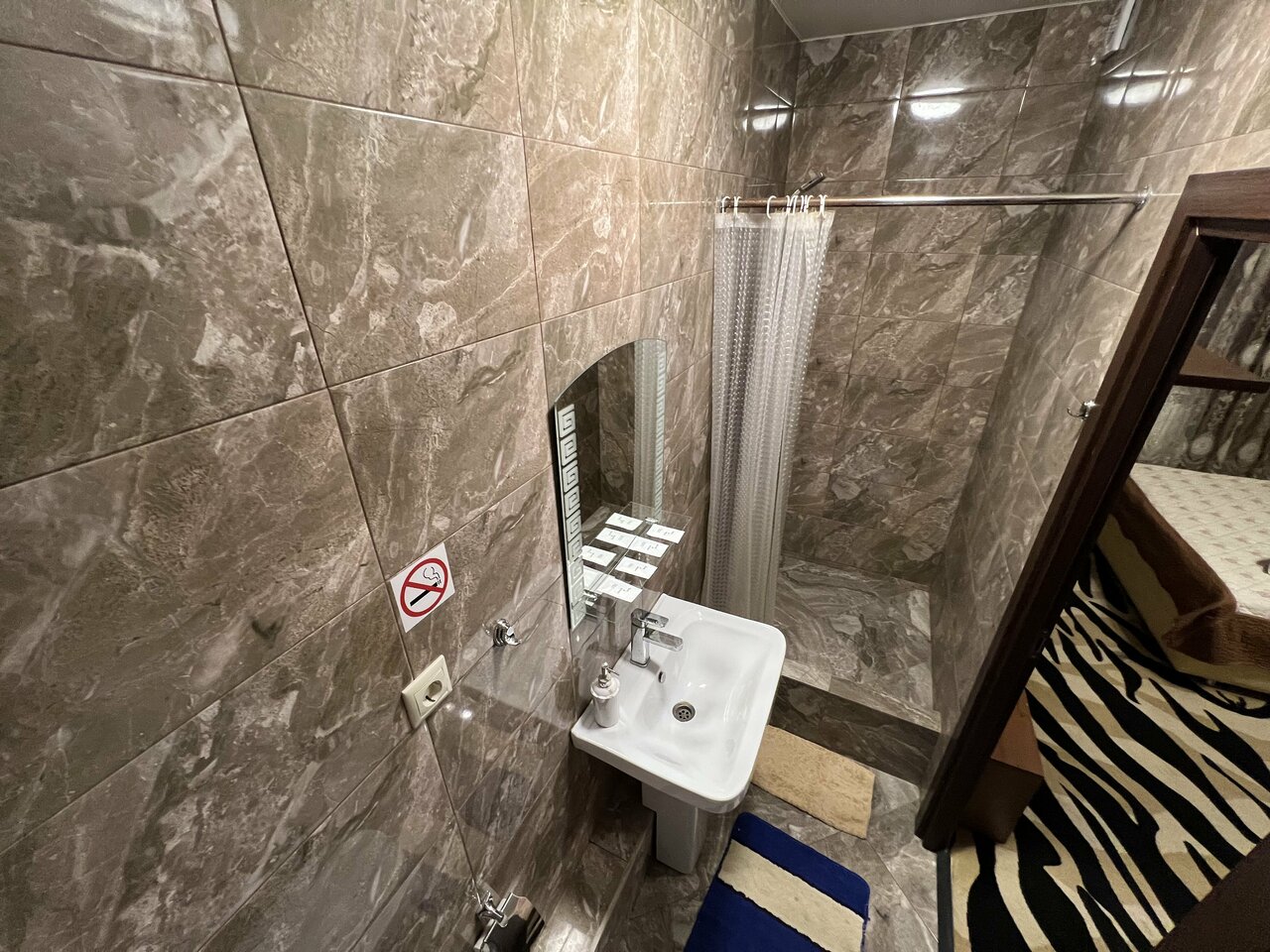 Очень тесный душ , ещё и течёт со всех сторон, есть очень маленькие номера, кухня ниже среднего, но есть !