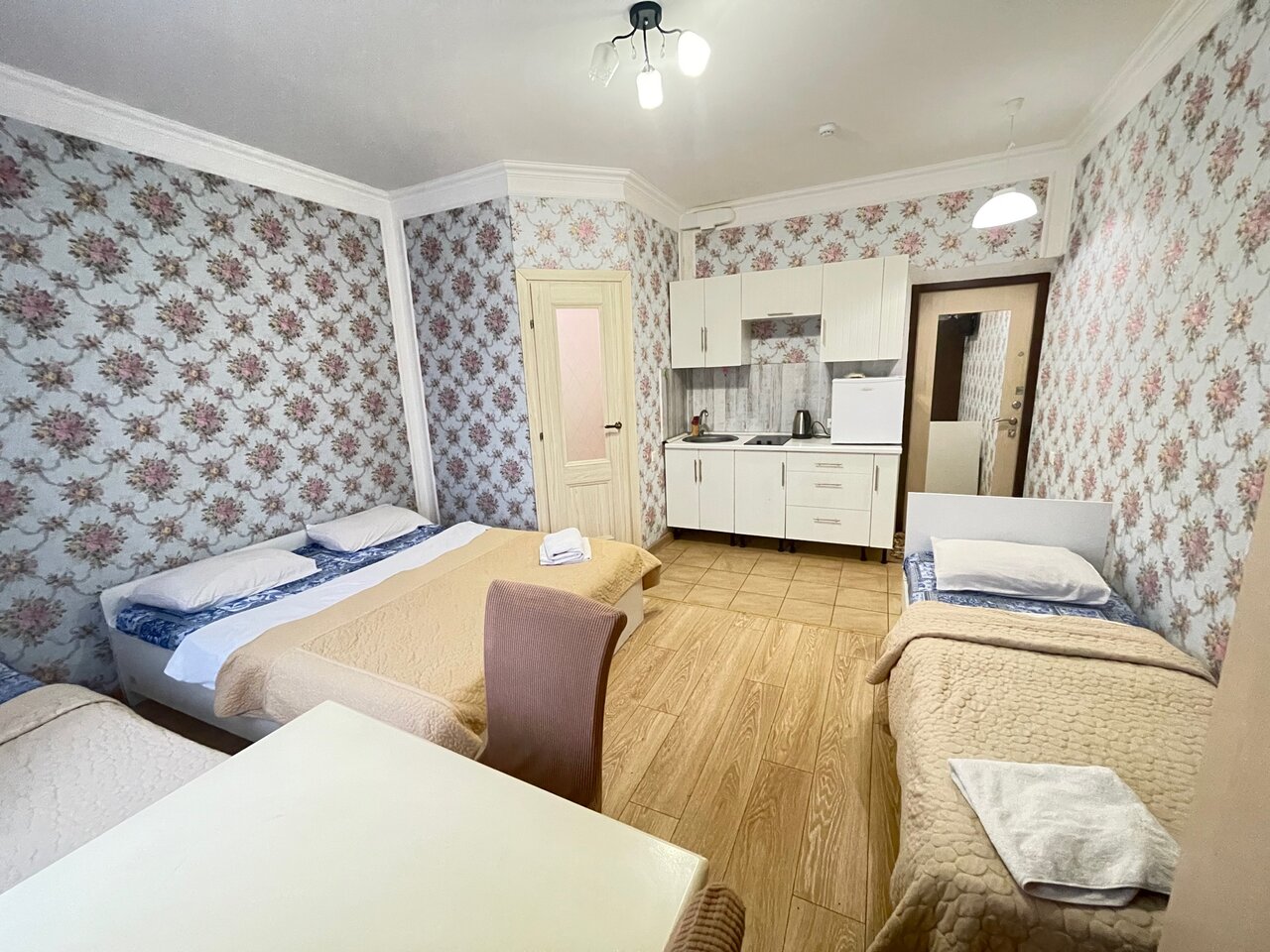 Были в шикарном номере , на втором этаже ( номер 4) Все чисто, тепло три кровати ( одна из них большая ) выдади тапочки сахар чай кофе. Хозяйка доброжелательная , приветливая. Единственное душ чуть брызгал в разнве стороны . Но мы с дочкой прекрасно чувствовали себя в современной комнате с кухней. Было все. Фото соответствуют действительности )