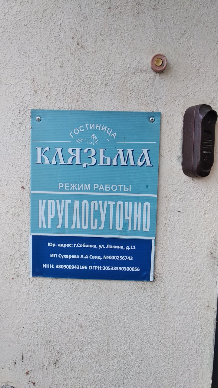 Гостиница «Клязьма» расположена в городе Собинка по адресу: улица Лакина, 11. Мини-отель работает круглосуточно и предлагает комфортные номера с санузлом, телевизором и интернетом (Wi-Fi на всей территории). Гости могут воспользоваться парковкой и круглосуточной стойкой регистрации. Отель находится вблизи центра (менее 1–5 км), питание не предоставляется. Подробности на сайте: http://www.klyazma.site/ или по телефону: +7 (49242) 2-22-21.