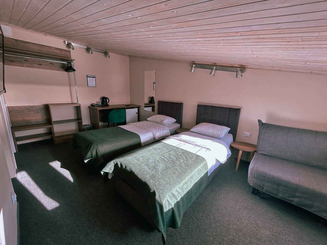 Две односпальных кровати и два раскладных кресла, душ и туалет в номере