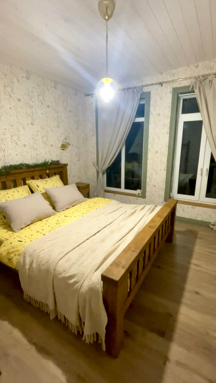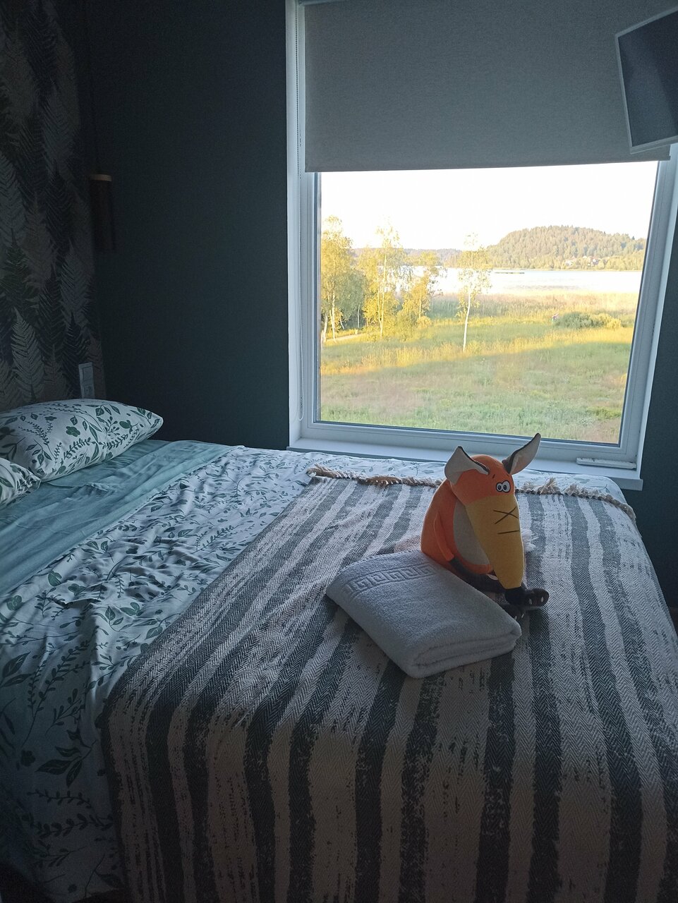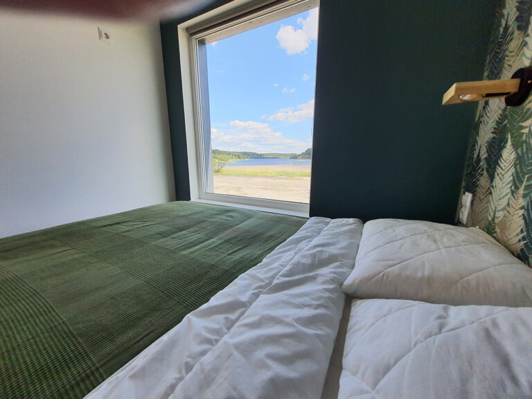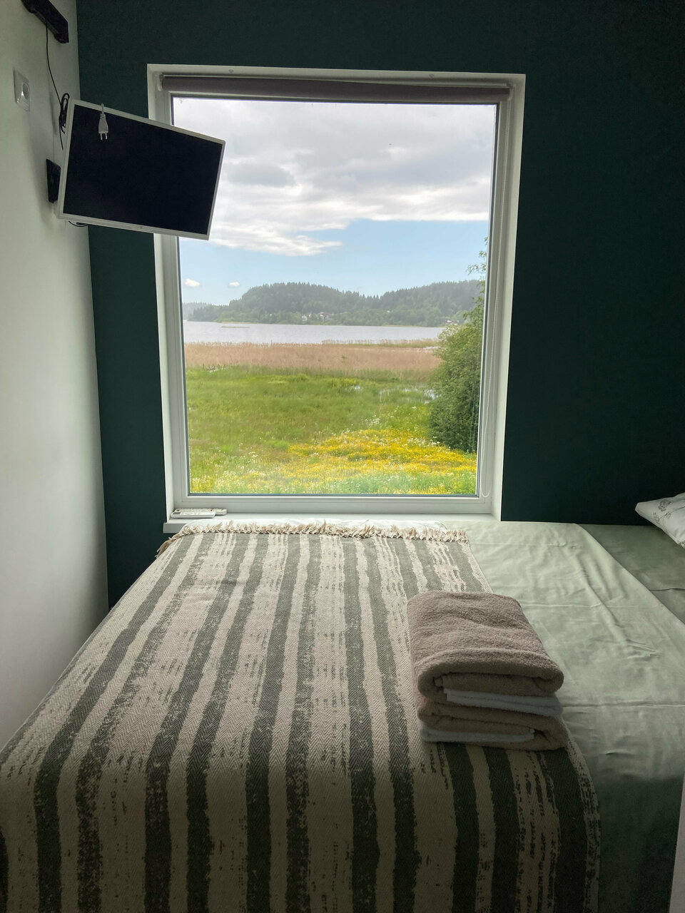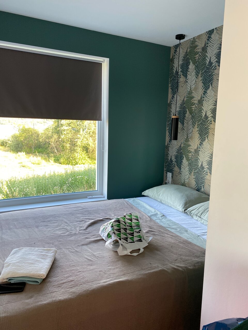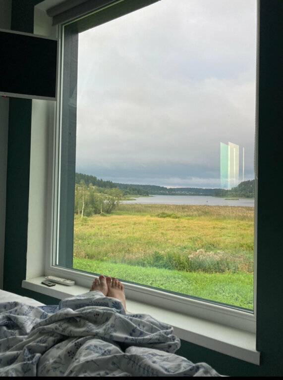 Великолепный вид , лёжа на кровати. Прекрасный интерьер от покинувшей нас икеи) из домика можно вообще не выходить) очень понравилось . И снаружи простор и речка