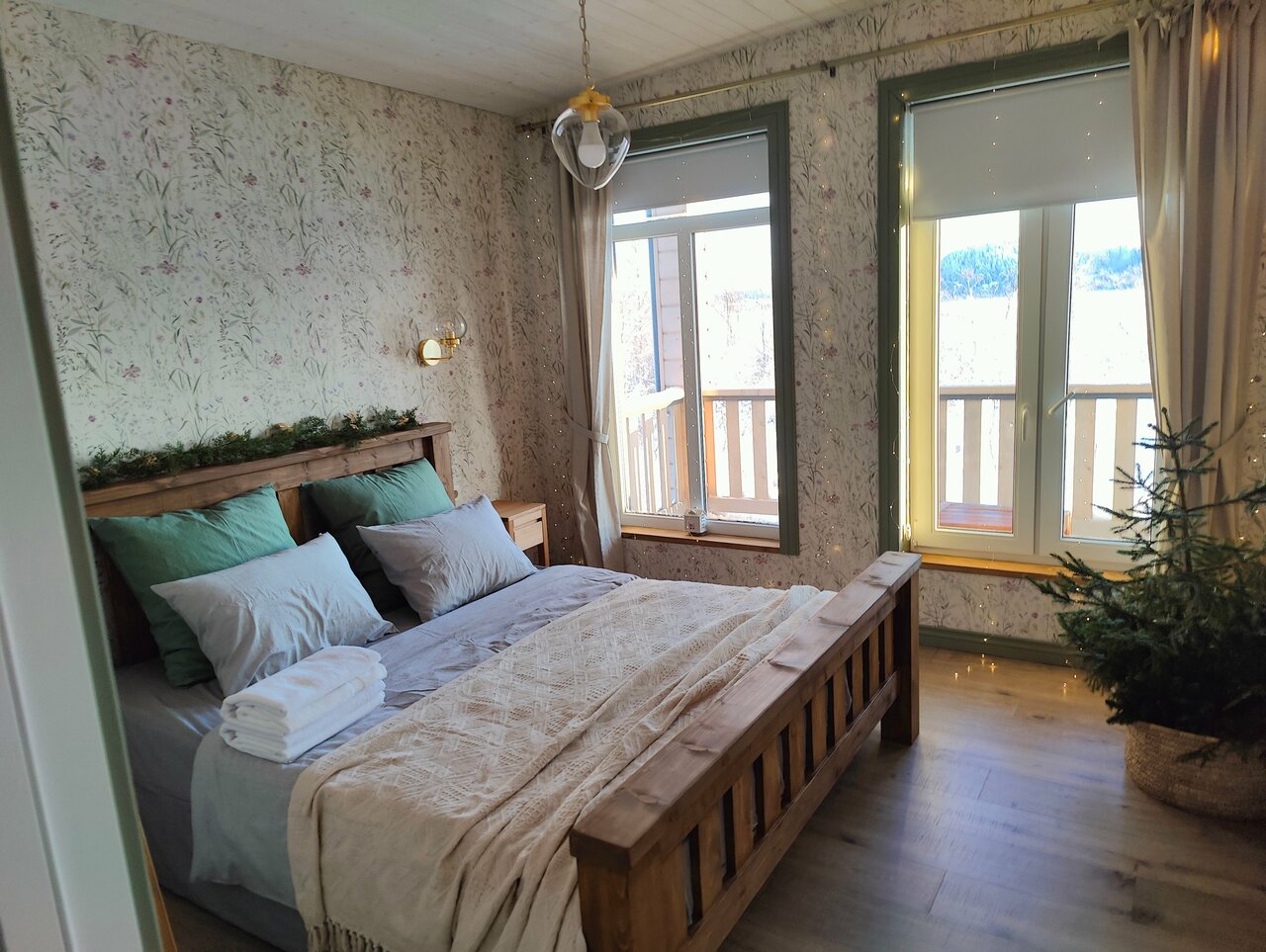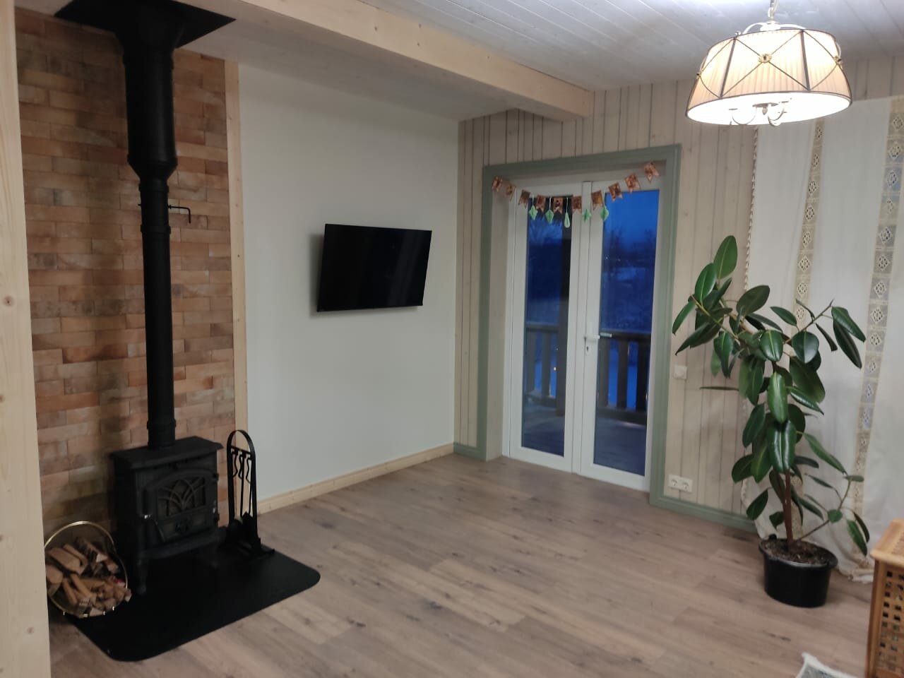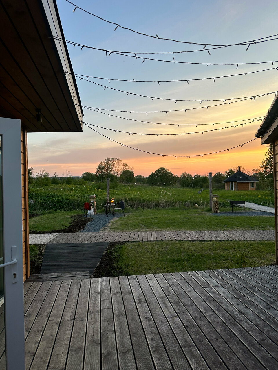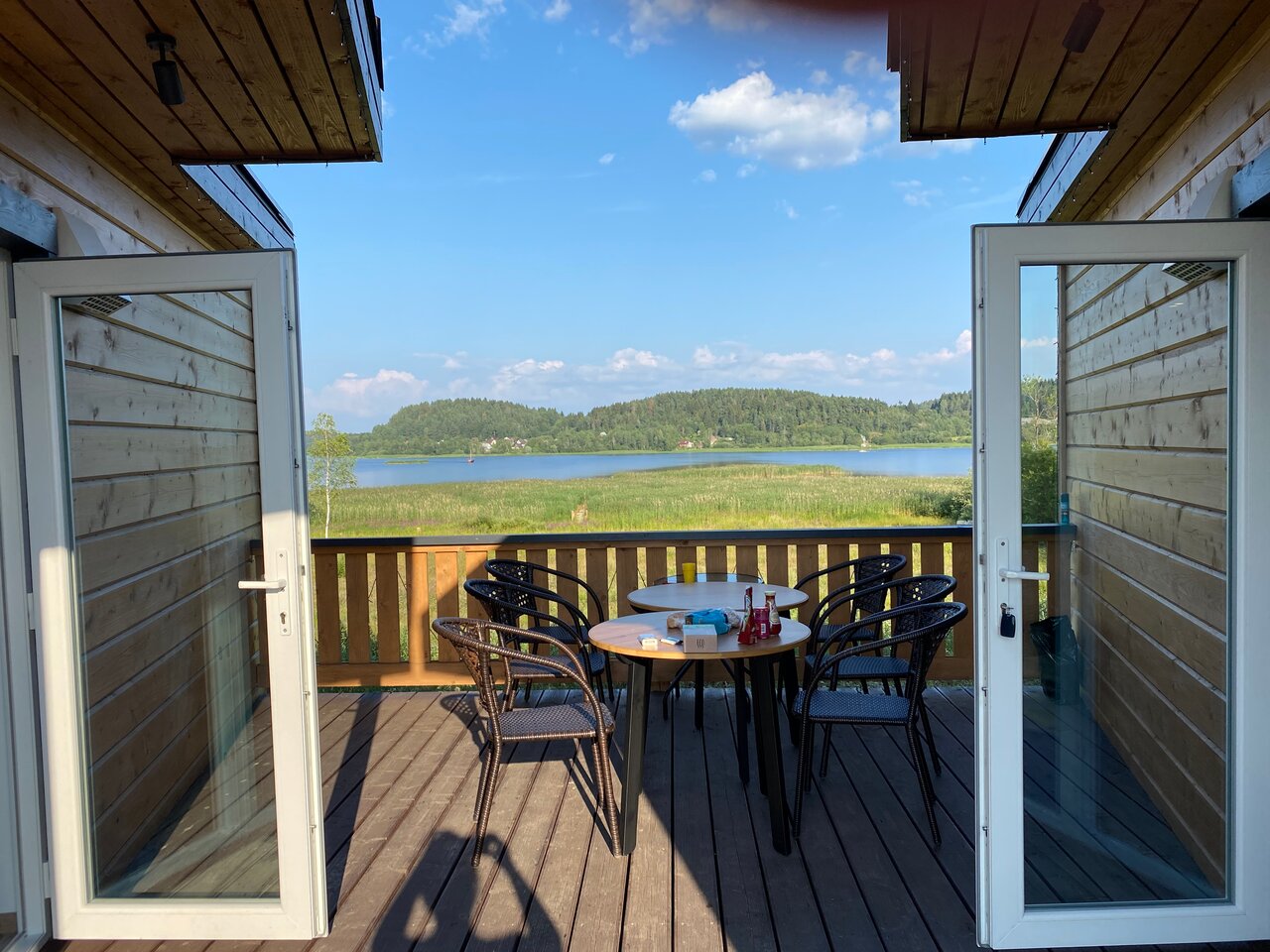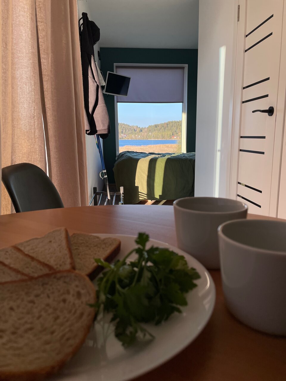Великолепный вид , лёжа на кровати. Прекрасный интерьер от покинувшей нас икеи) из домика можно вообще не выходить) очень понравилось . И снаружи простор и речка