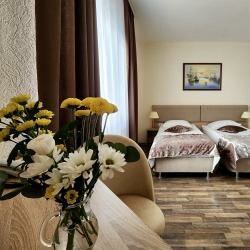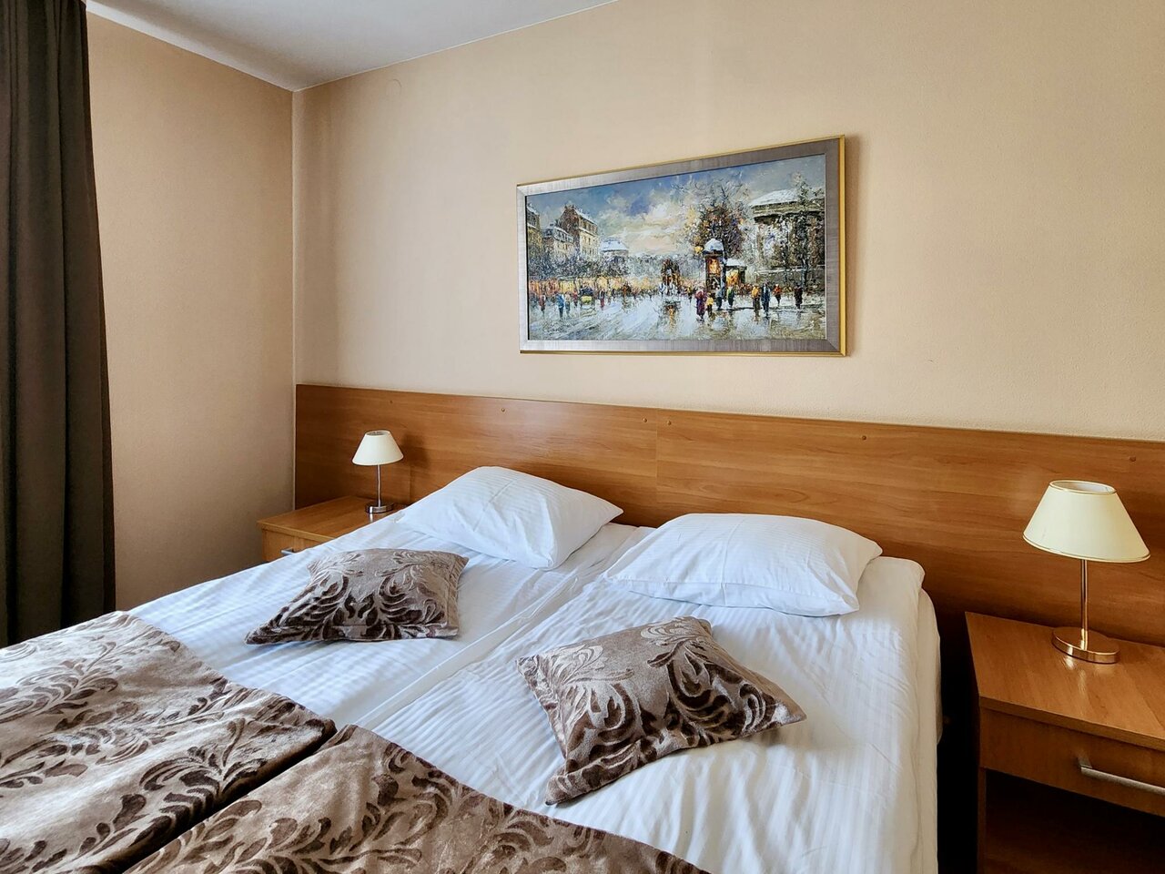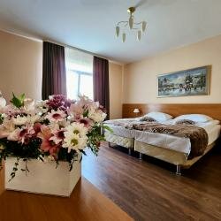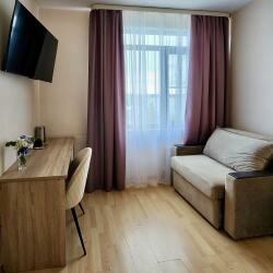 Спальня: Двуспальная кровать или две односпальные кровати, письменный стол, шкаф, телевизор со Smart TV, телефон с междугородней связью, Wi-fi.Удобства: душ, туалет, фен, 2 полотенца на человека.