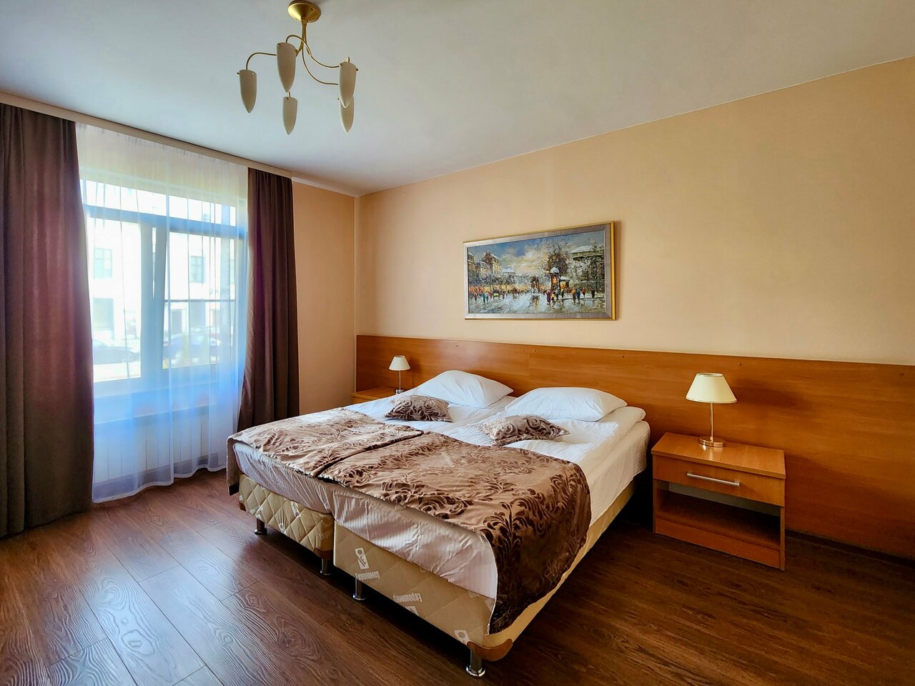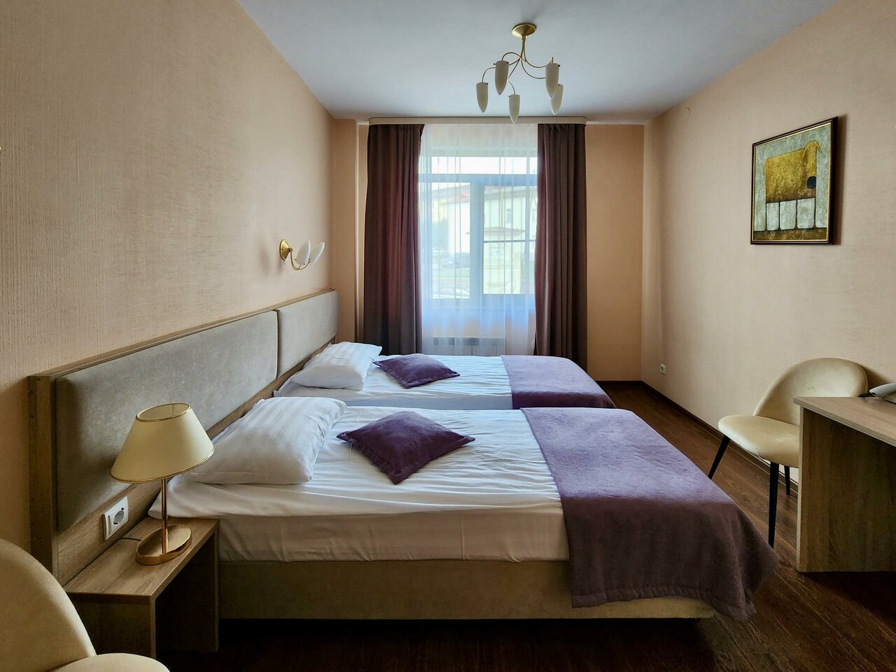 Спальня: две двуспальные кровати или одна двуспальная и две односпальные кровати, письменный стол, шкаф, Smart TV, телефон с междугородней связью, Wi-fi.Удобства: душ, туалет, фен, 2 полотенца на человека.