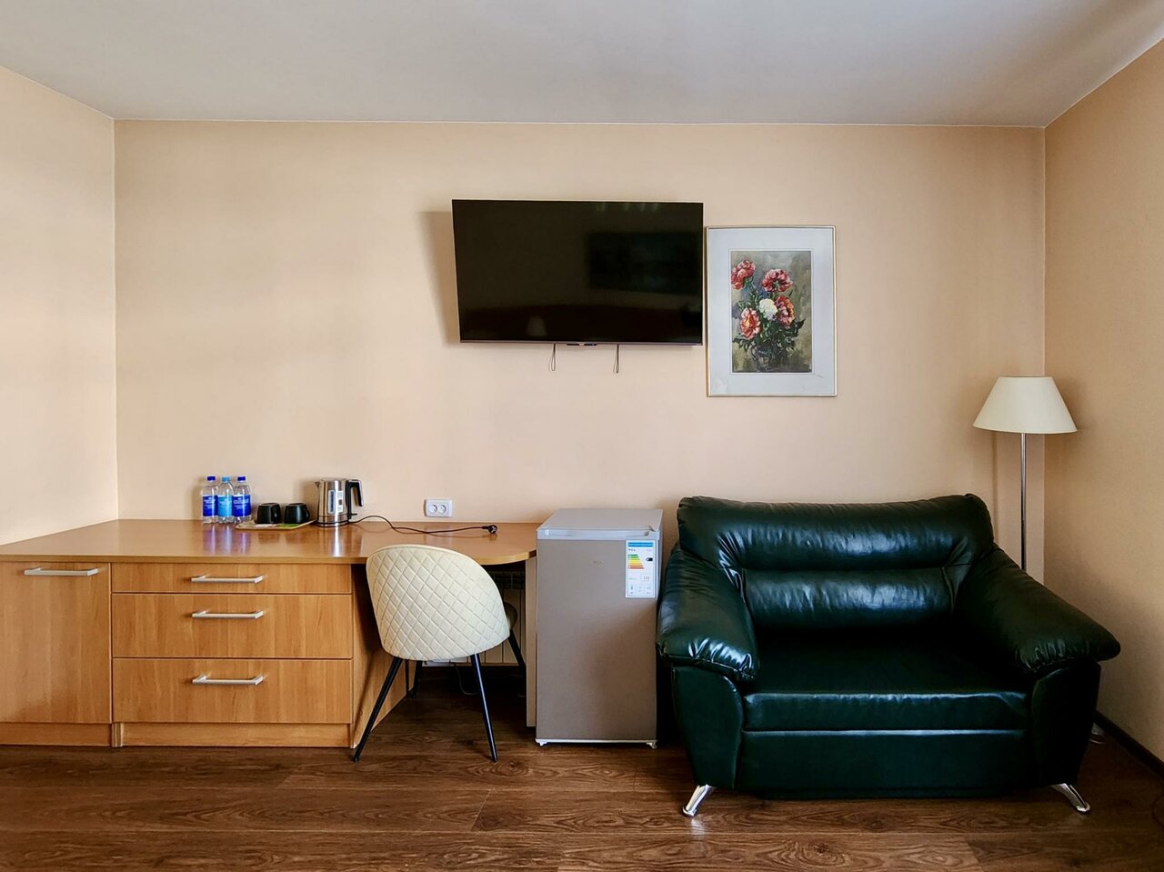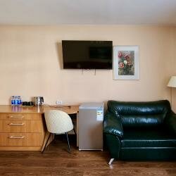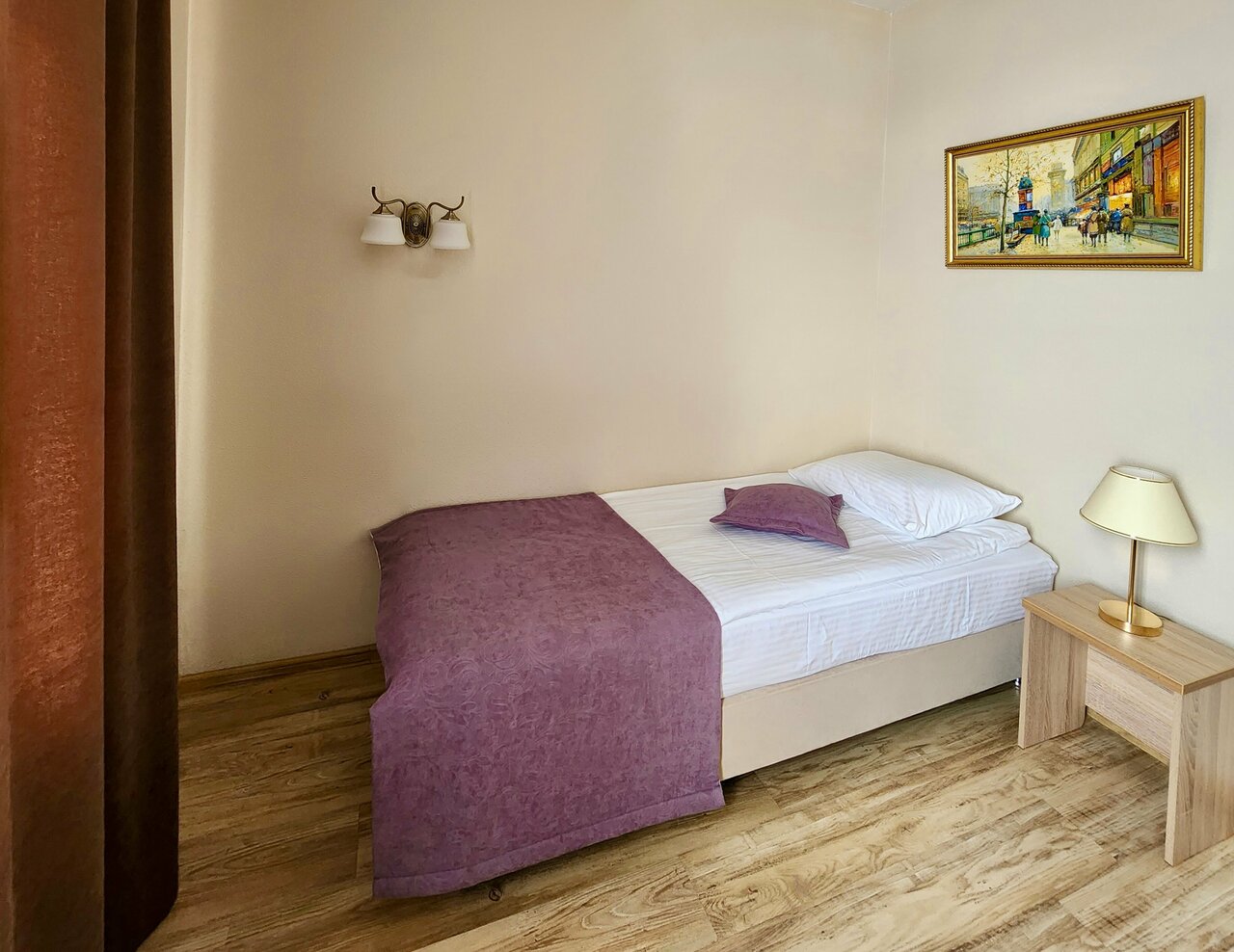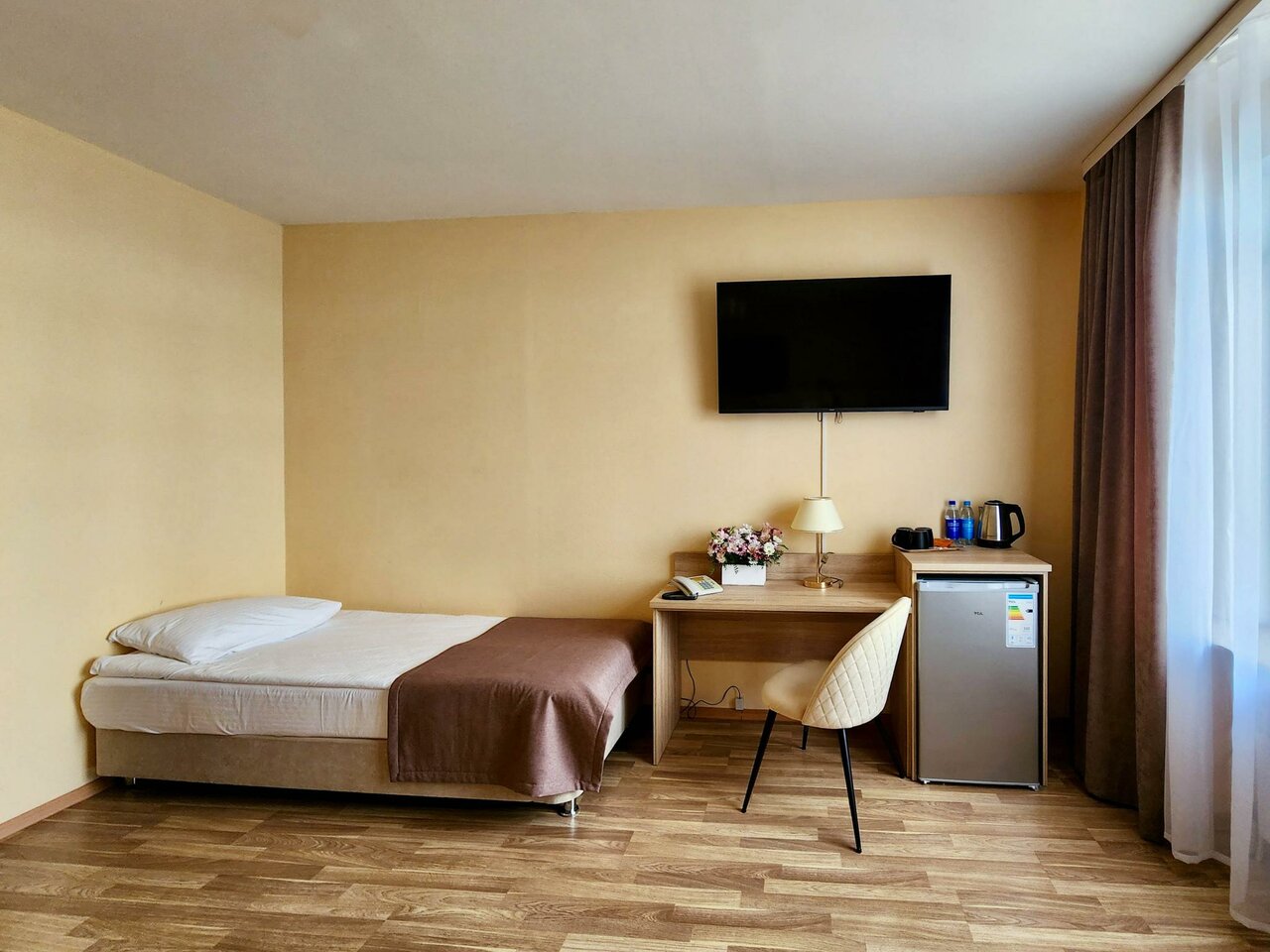 Спальня: односпальная кровать, письменный стол, шкаф, Smart TV, телефон с междугородней связью, Wi-fi.Удобства: душ, туалет, фен, 2 полотенца на человека.
