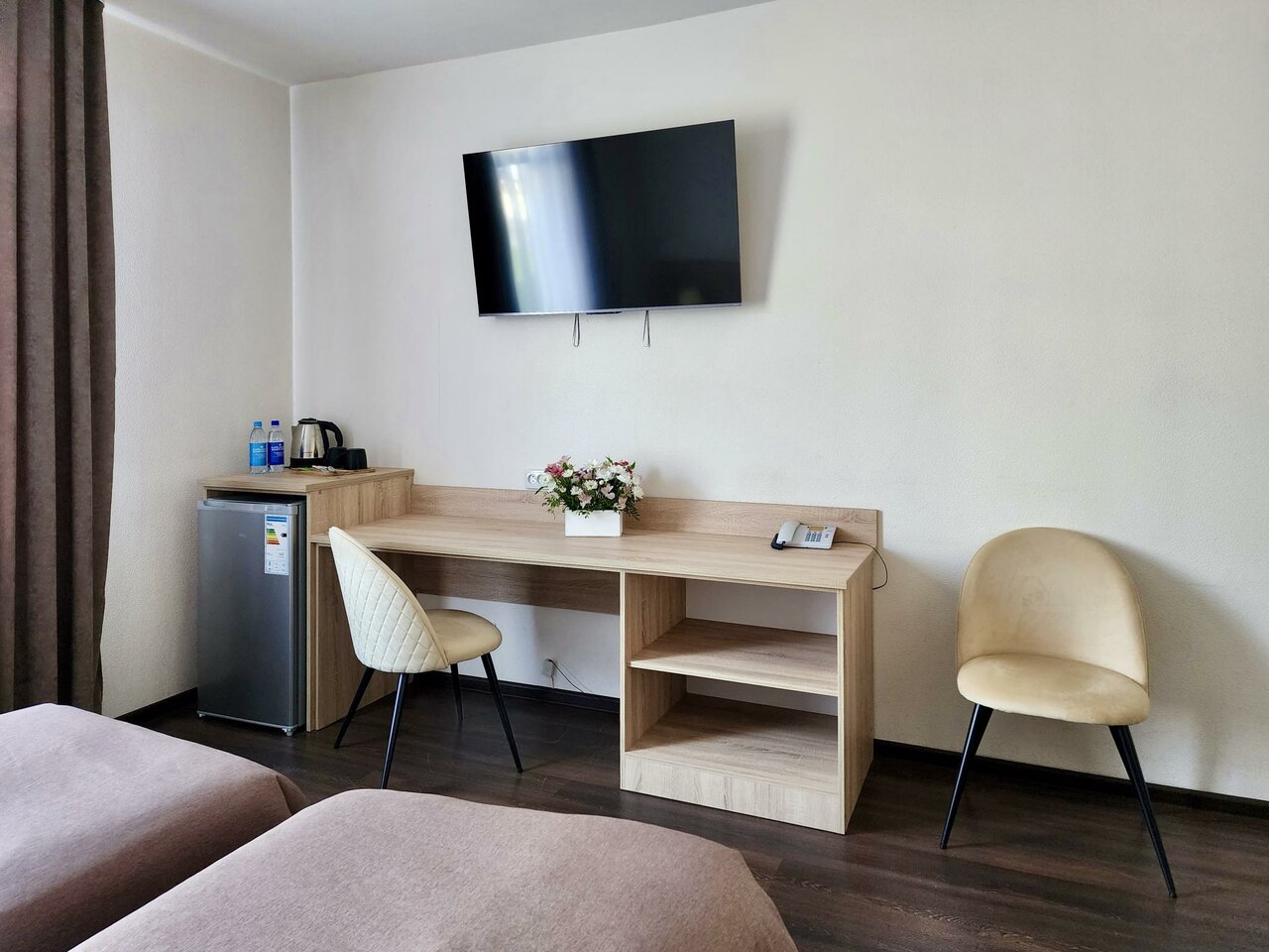 Спальня: три односпальных кровати, письменный стол, шкаф, Smart TV, телефон с междугородней связью, Wi-fi.Удобства: душ, туалет, фен, 2 полотенца на человека.