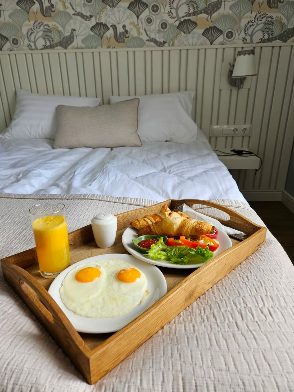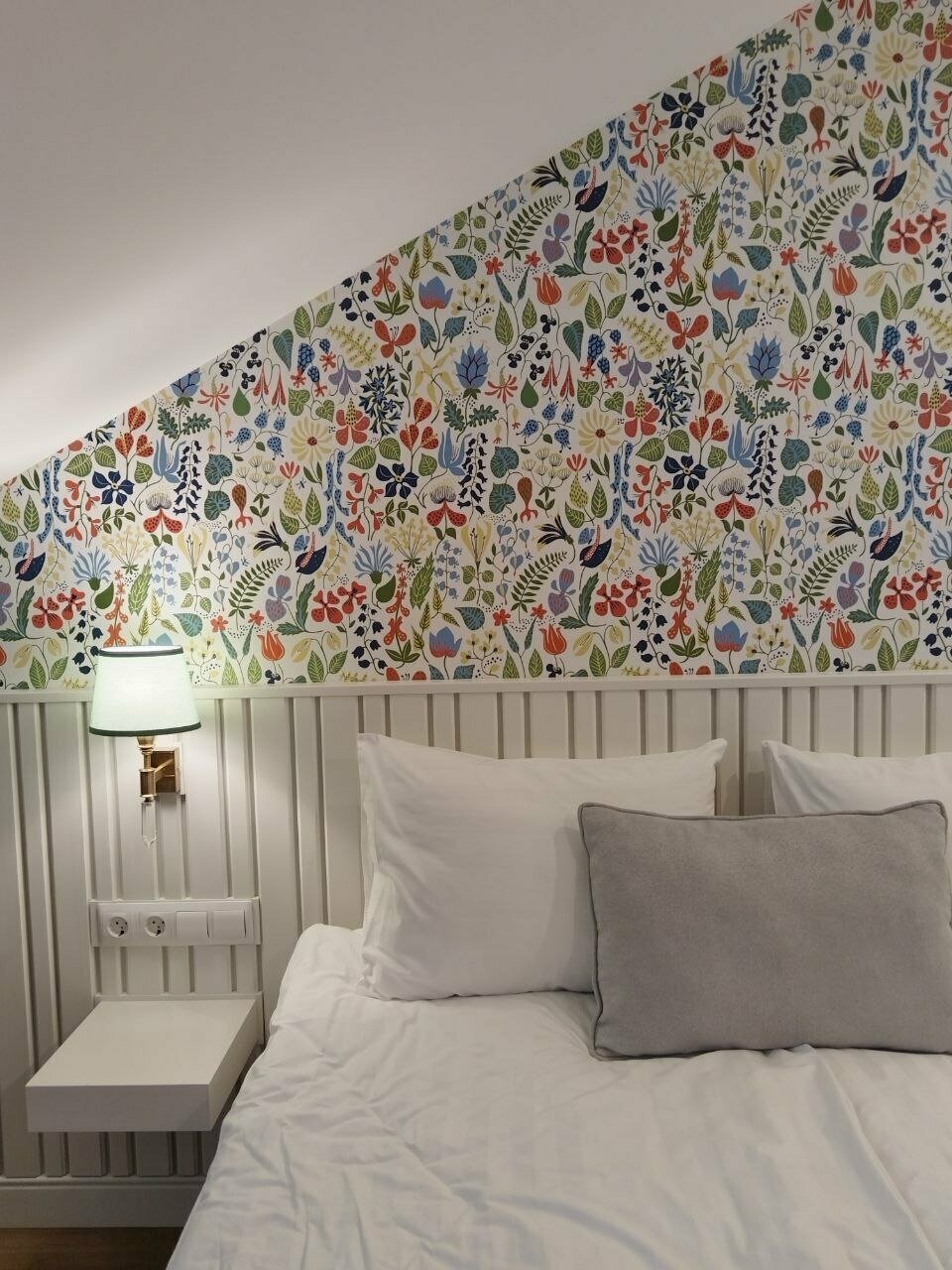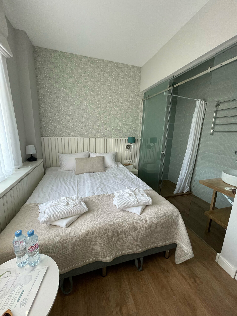 Гостиница-келья с красивыми обоями и отличным расположением. Из плюсов- свежий чистый ремонт, приятный дизайн, хороший матрас. На этом все. Мы расположились в 2 номерах, шкафов нет. Есть легкая конструкция с 2 вешалками или полочки — если у вас один мини чемодан, то вам сюда. Мы, как путешественники, были с несколькими чемоданами, они лежали повсюду в номере на полу. Завтрак в номере- подносы не помещаются на мини столике, если вы романтик пара, то завтрак в постели хорошая идея. Если как мы с ребенком — будете есть за подоконником, он широкий. Грязную посуду складывать некуда, я разложила все на свои вещи. Капсулы для кофемашины неоригинальные, поэтому кофемашина заедает. Чашки по размеру в нее не входят. Это бутик-отель? Нет, конечно! Общей зоны нет, то есть вы покупаете за эту стоимость только номер, небольшой. Территории нет совсем, гостиница стоит на асфальте на общей парковке с другими зданиями. Считаю, что своих денег это совсем не стоит. Никакой продуманности здесь нет.