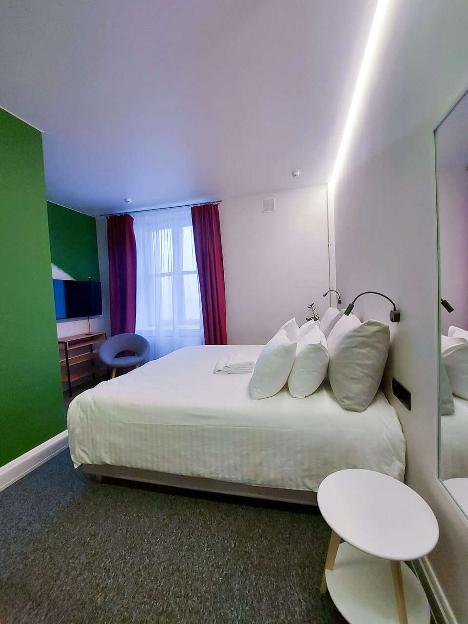 Уютный номер для двоих со всеми удобствами. Дизайнерская мебель, ортопедические матрасы, гипоалергенное белье, халаты, тапочки, фен и всё, что необходимо для комфортного отдыха.